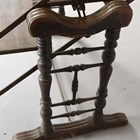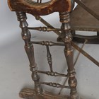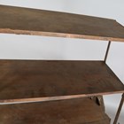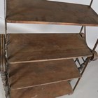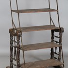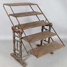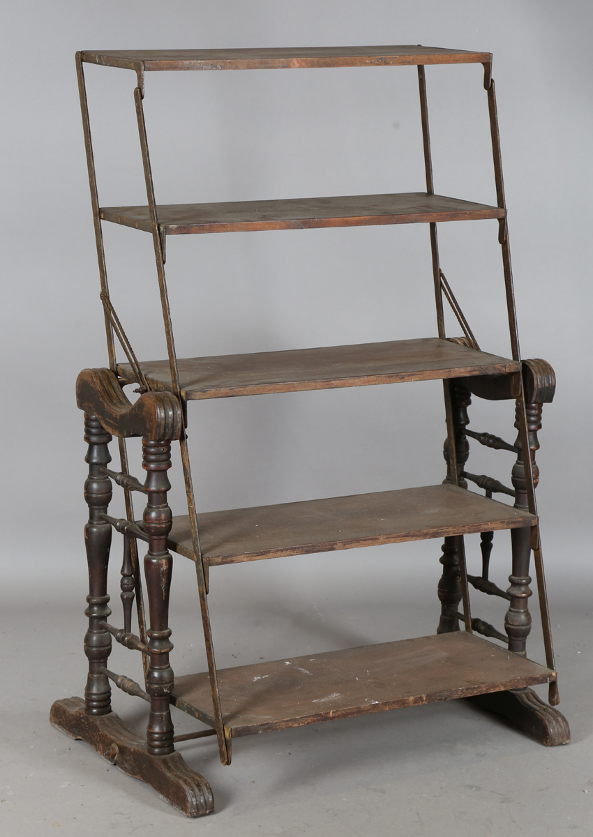 A late 19th/early 20th century American walnut and wrought iron mounted metamorphic shelf table, designed and patented in 1896 by The Combination Table Co, Indianapolis, height 139cm, width 91cm, depth 59cm.