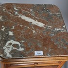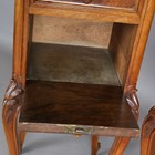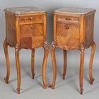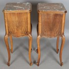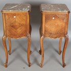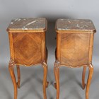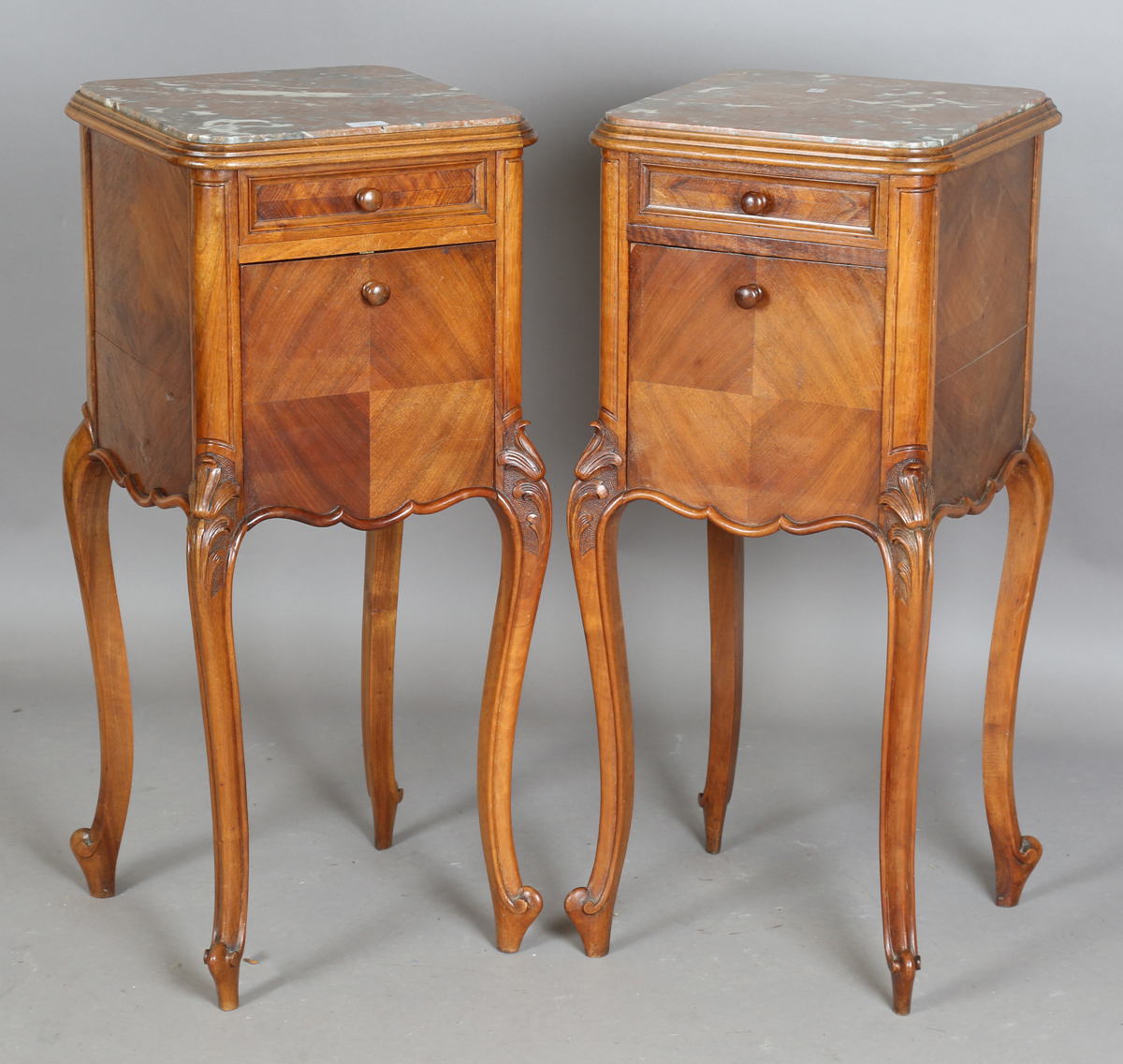 A pair of early 20th century French walnut bedside cabinets, each with a rouge marble top above a drawer and cupboard, height 88cm, width 40cm, depth 40cm.