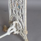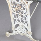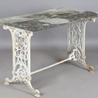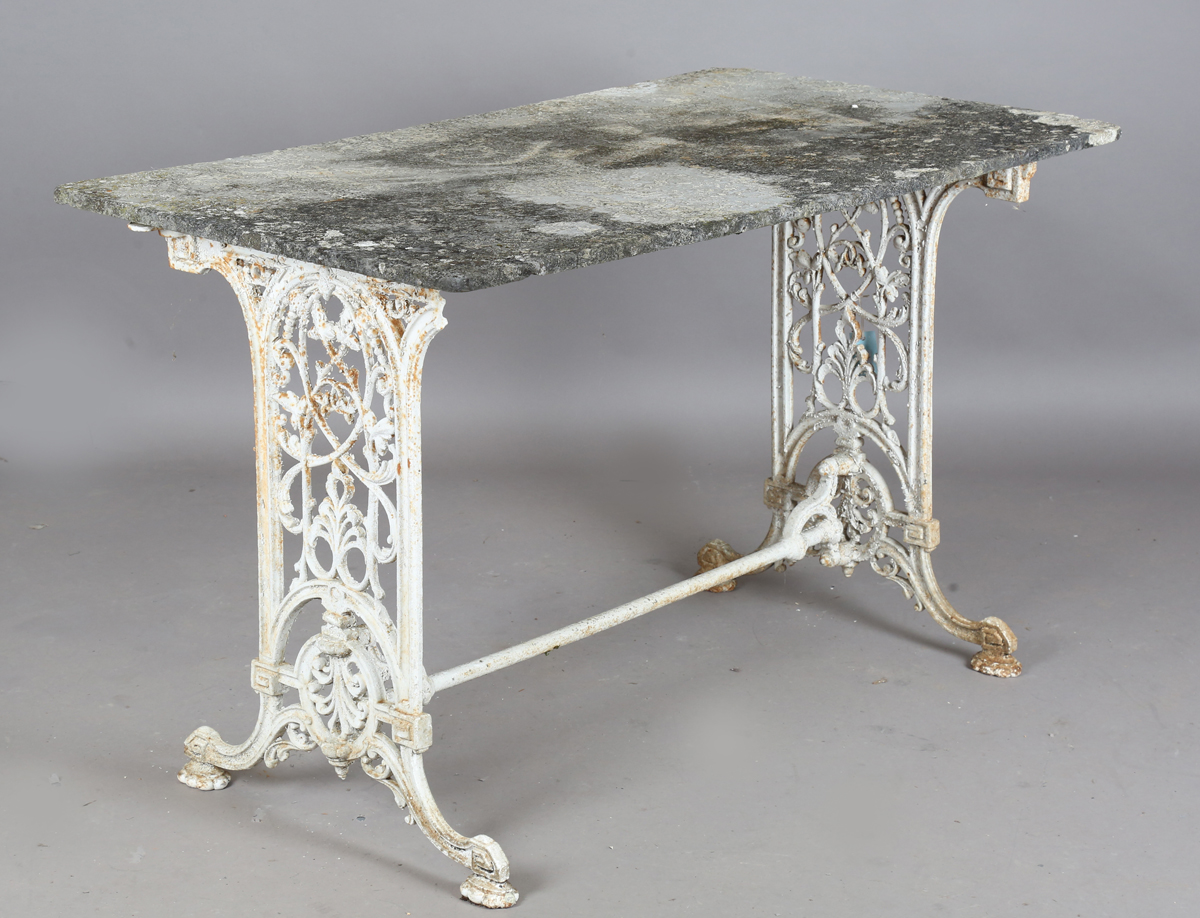 A Victorian white painted cast iron rectangular garden table, the weathered marble top on palmette and scroll supports, height 75cm, length 123cm, depth 71cm.