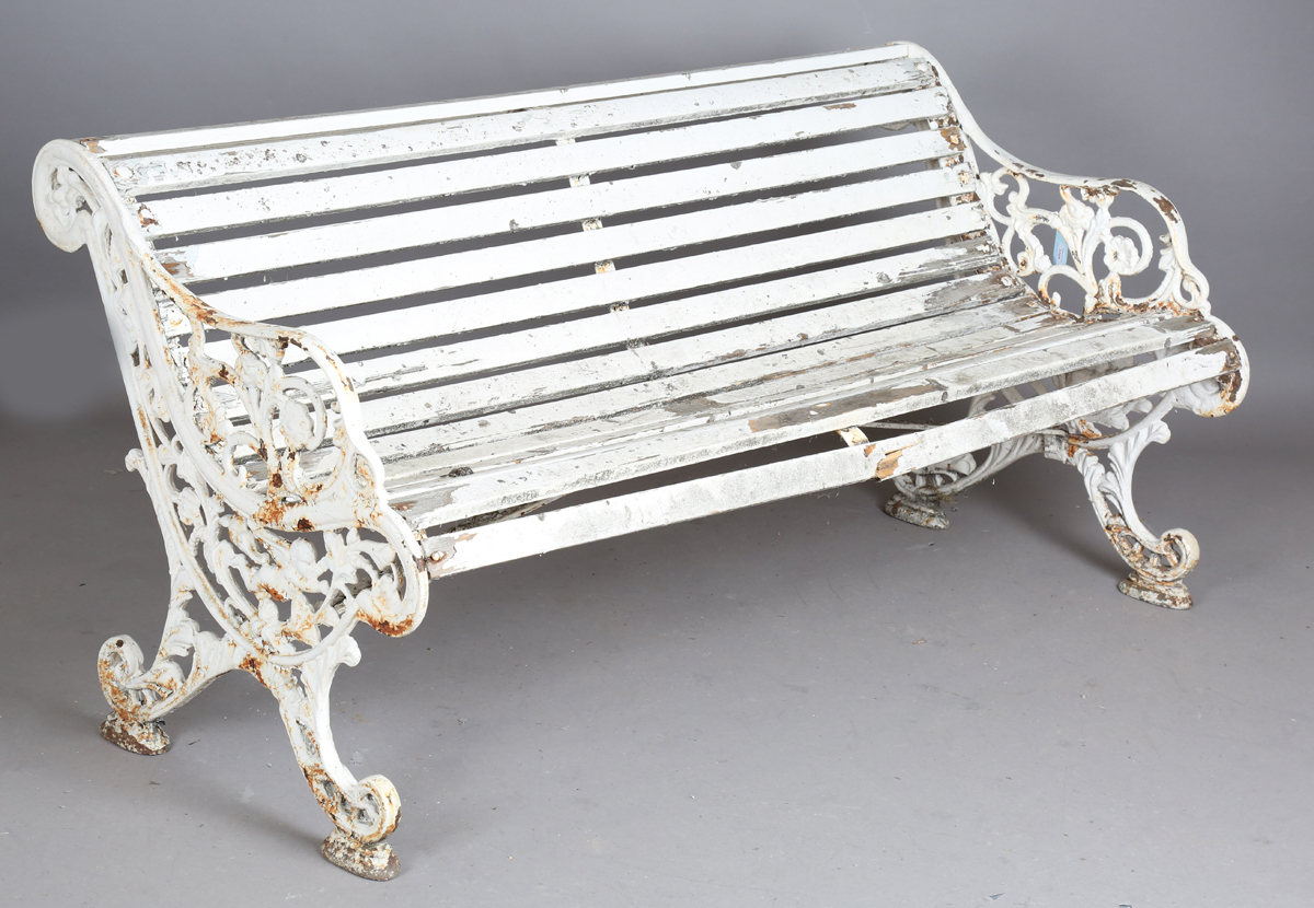 A Victorian white painted cast iron and wooden slatted garden bench with foliate scrolling ends, height 77cm, width 157cm, depth 78cm.
