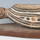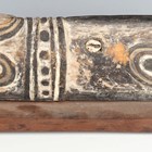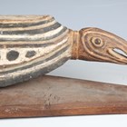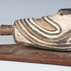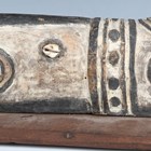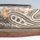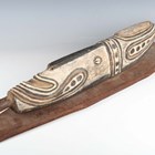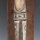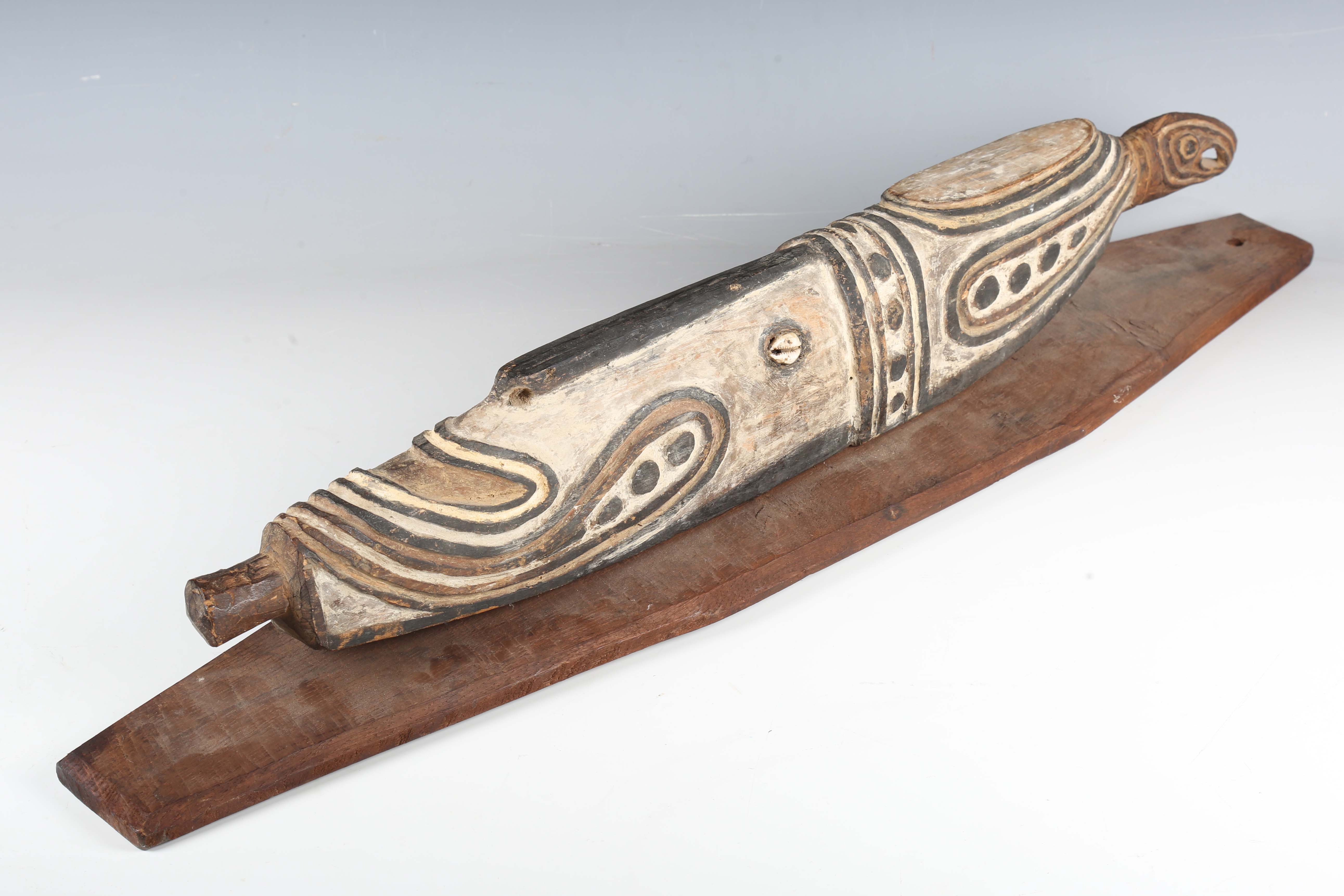 A Papua New Guinea Sepik River region carving with bird head finial and stylized facial features, length 65cm, mounted to a wall plaque.