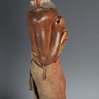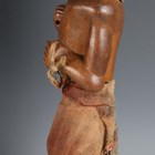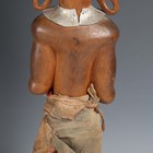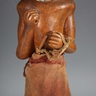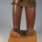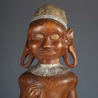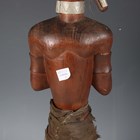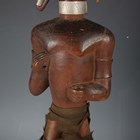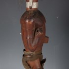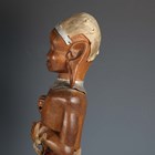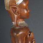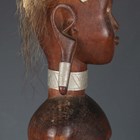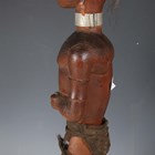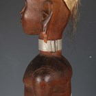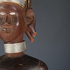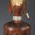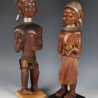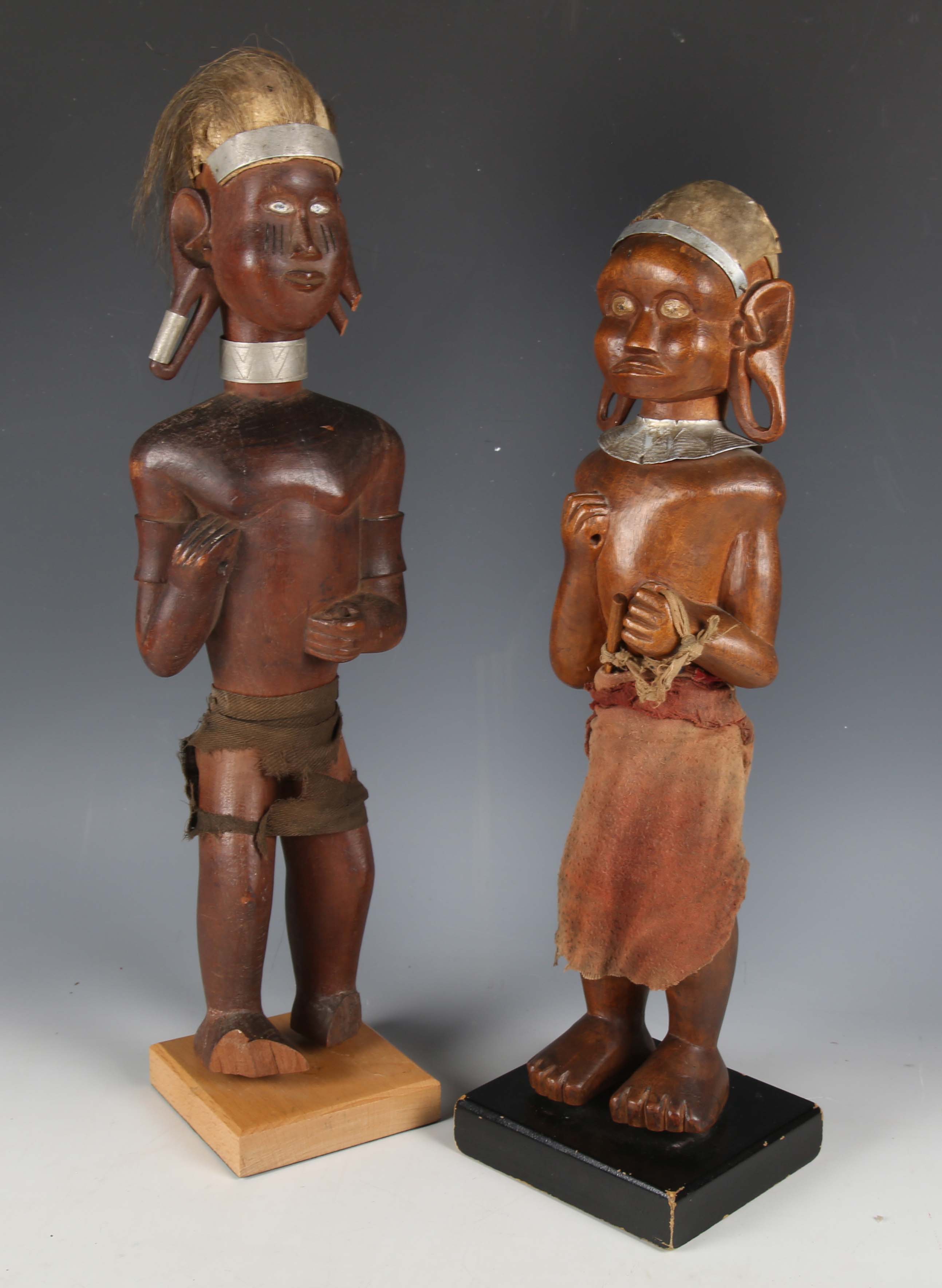 A Kamba carved wooden standing male figure, Kenya, with applied hair and aluminium jewellery, height 43cm, together with a similar Kamba female figure, height 39cm (some faults). Provenance: from the personal collection of Monika Wengraf, Arcade Gallery, Royal Arcade, London.