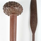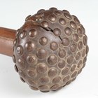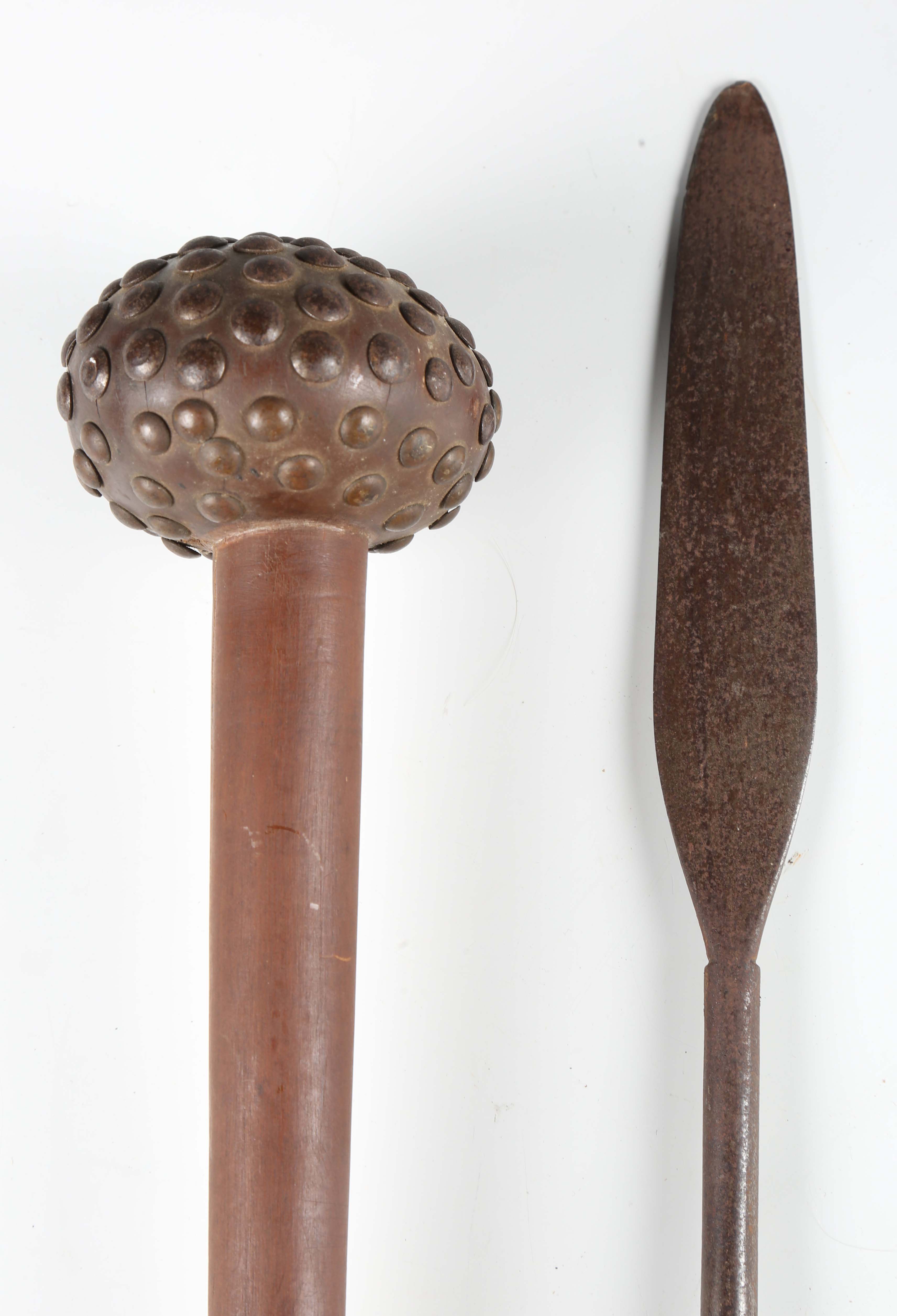 An African knobkerrie with a metal-studded bulbous head, length 91cm, together with an African spear with hardwood shaft, length 118cm.