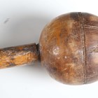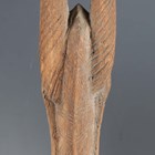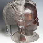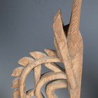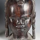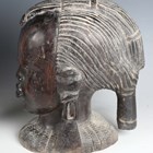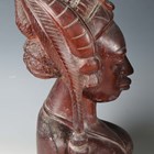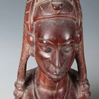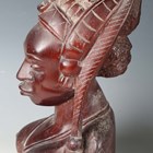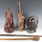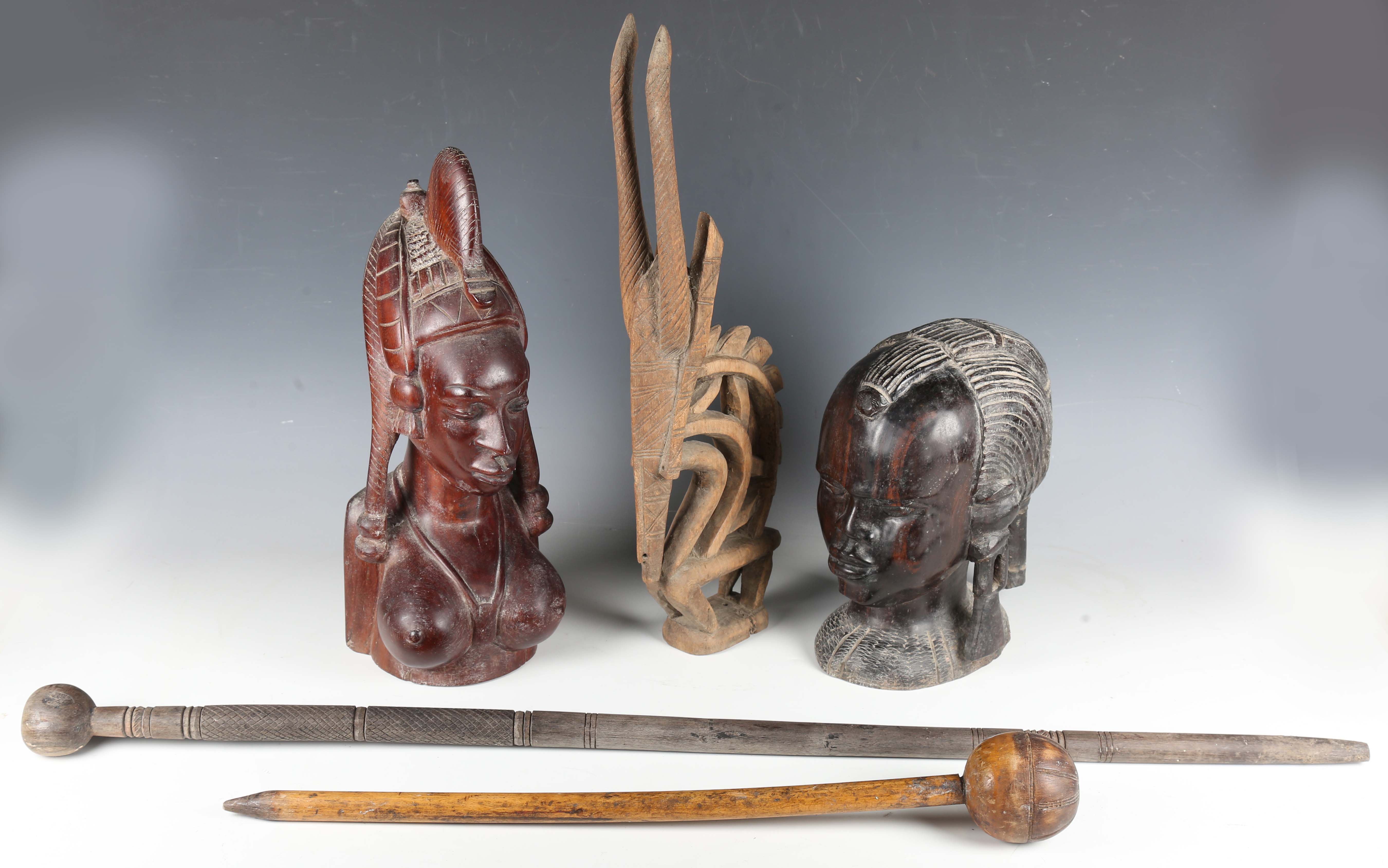 A Bambara Chiwara headdress of antelope form, height 50cm, two African carved hardwood busts, a knobkerrie and an African carved wooden staff.