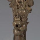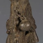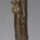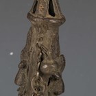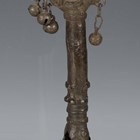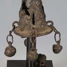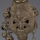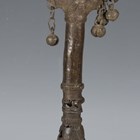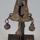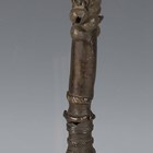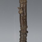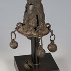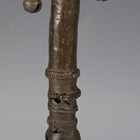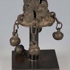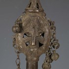 A Yoruba Edan cast bronze staff finial, West Africa, the pierced leaf form end with stylized facial features and applied with bells, length 30cm, later mounted on a stand. Provenance: from the personal collection of Monika Wengraf, Arcade Gallery, Royal Arcade, London.