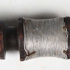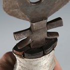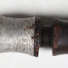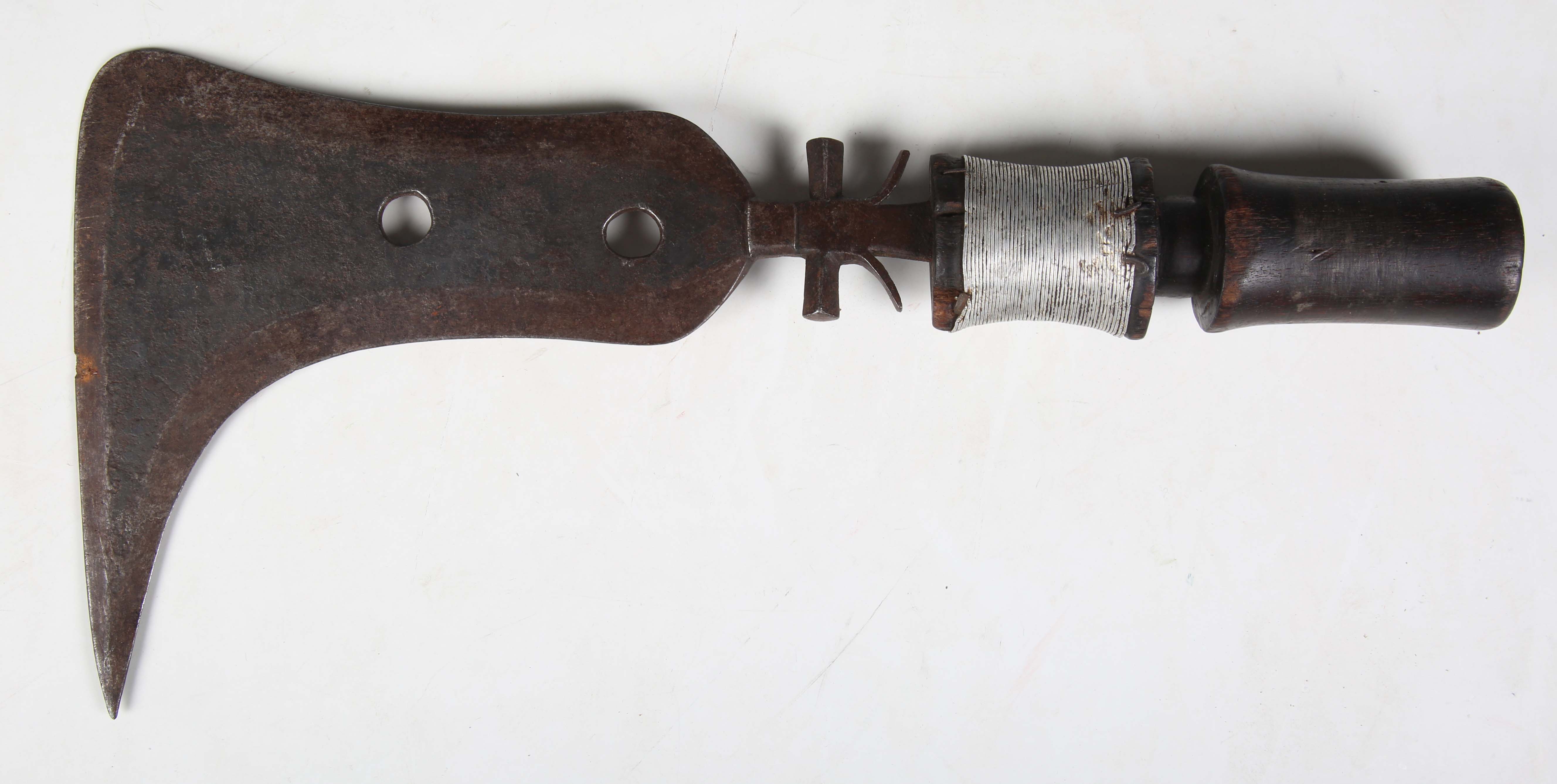A Mangbetu trumbash throwing knife, Democratic Republic of Congo, the wooden handle with wire-bound collar, length 36cm. Provenance: from the personal collection of Monika Wengraf, Arcade Gallery, Royal Arcade, London.