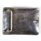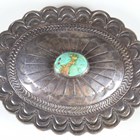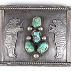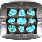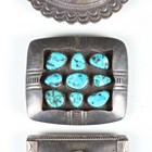 A 20th century Native American silver and turquoise inset belt buckle, incised 'Aaron Chischiligi Navajo', width 7.5cm, together with two similar buckles, one stamped 'J. Mezzie' to reverse.