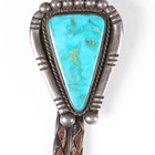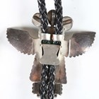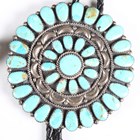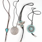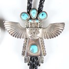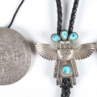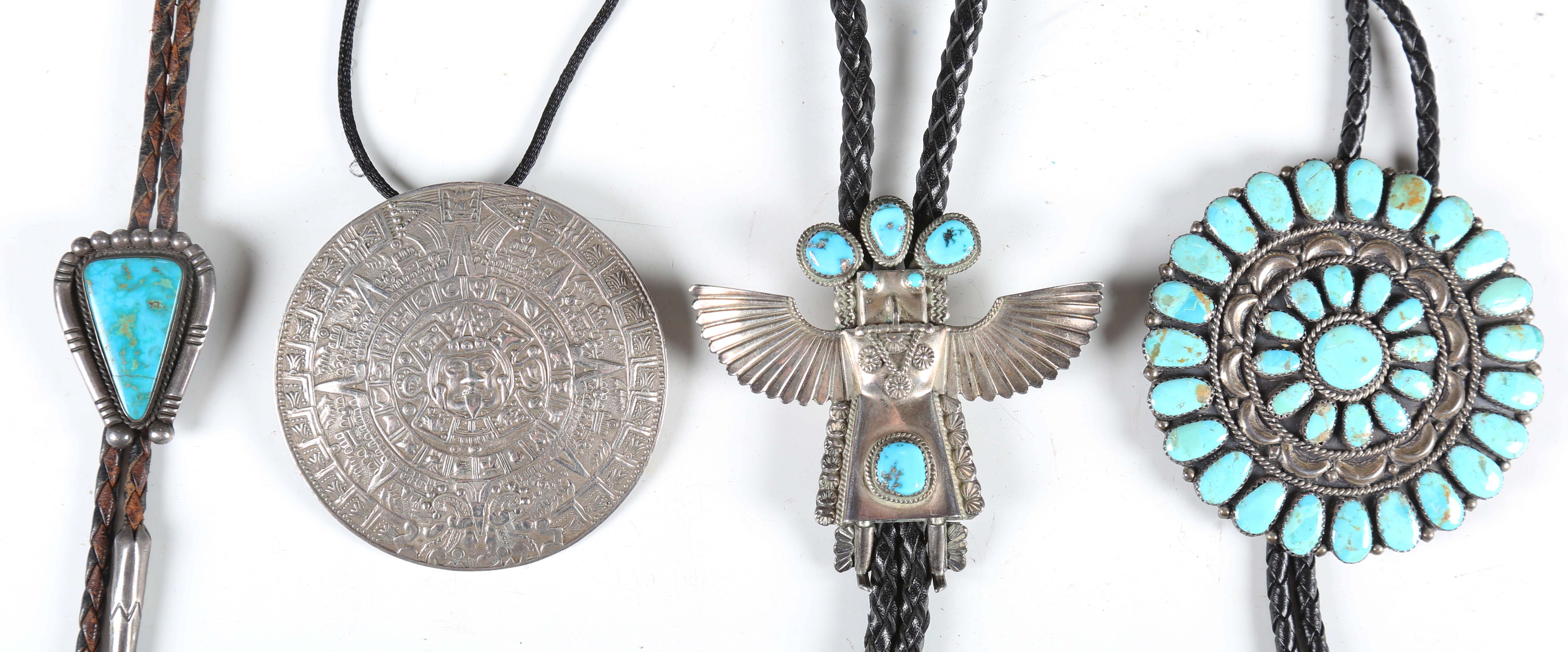 A 20th century Native American silver and turquoise inset bolo tie, the slider modelled as an eagle dancer, together with a similar rosette bolo tie and a Mexican silver pendant.
