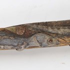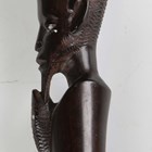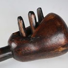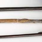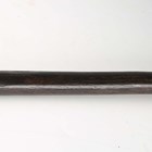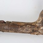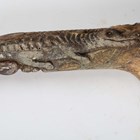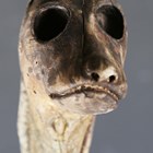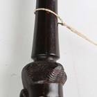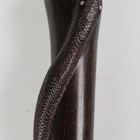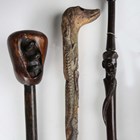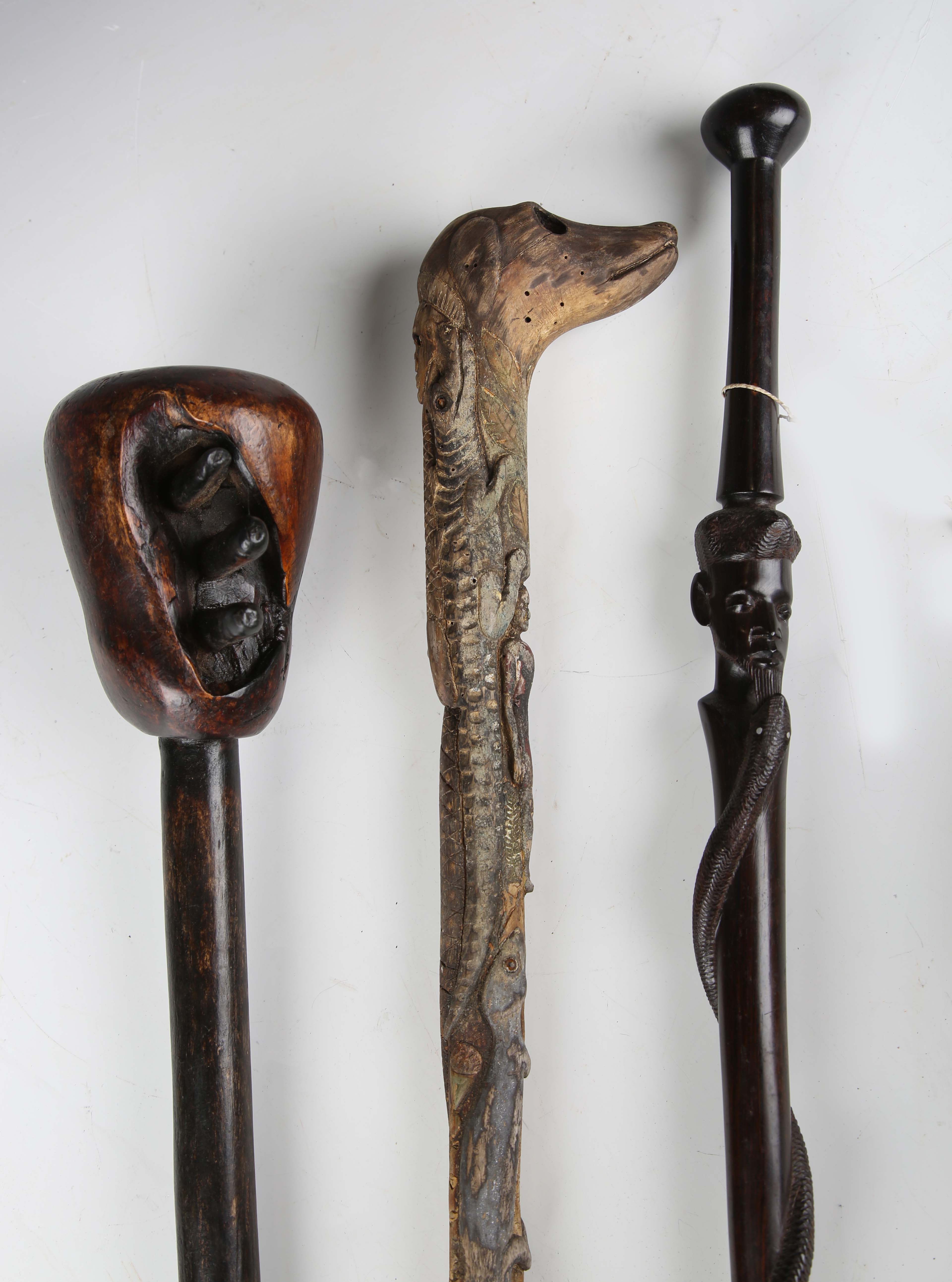 An African hardwood club, the bulbous head with three protruding knobs, length 64cm, an African carved hardwood staff with figural stem, length 92cm, and a carved stick with dog's head handle above serpent, figure, lizard and crocodile, length 88cm.