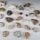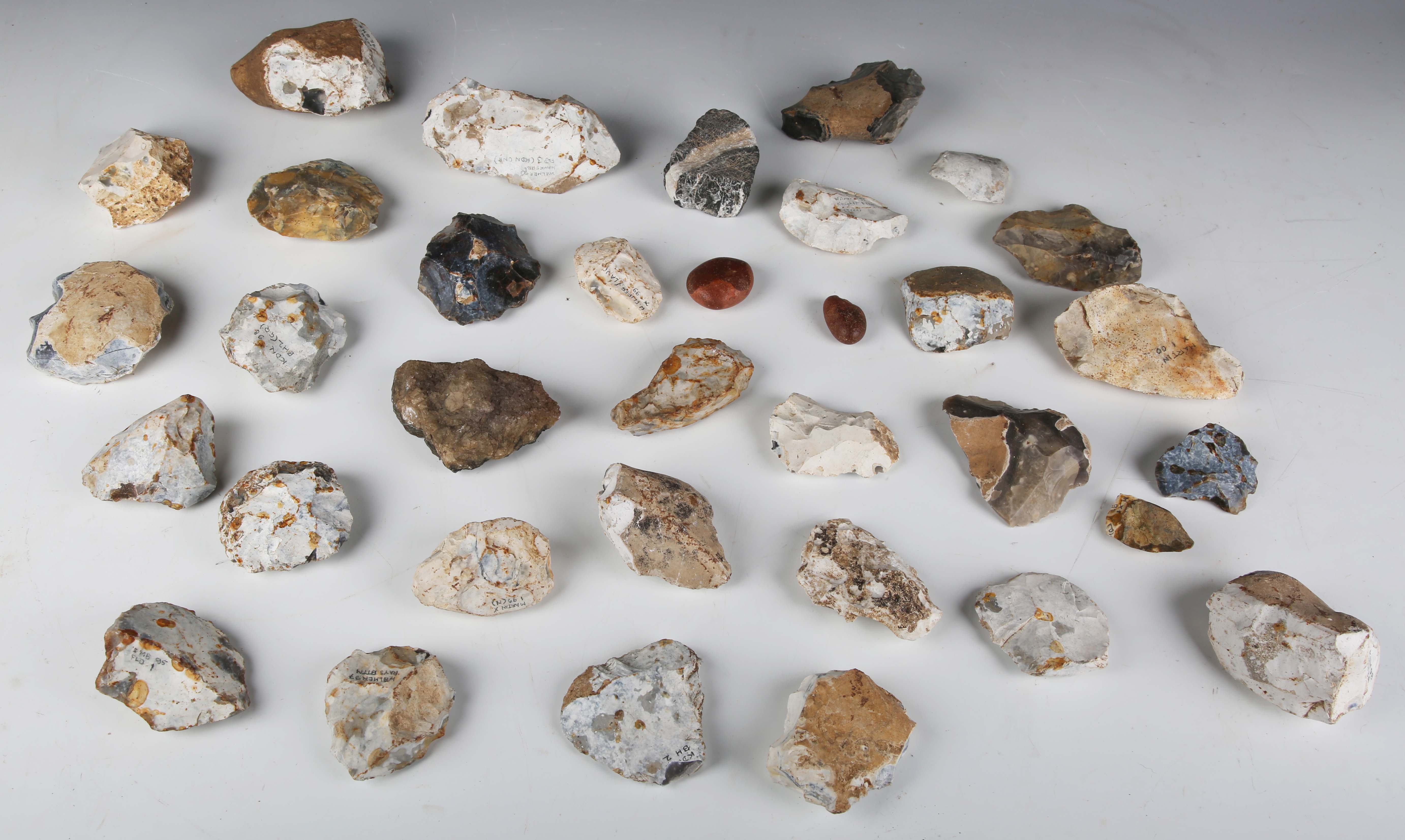 A collection of Neolithic flint debotage scrapers and hand tools, the majority detailed with find sites and dates.