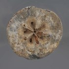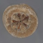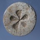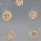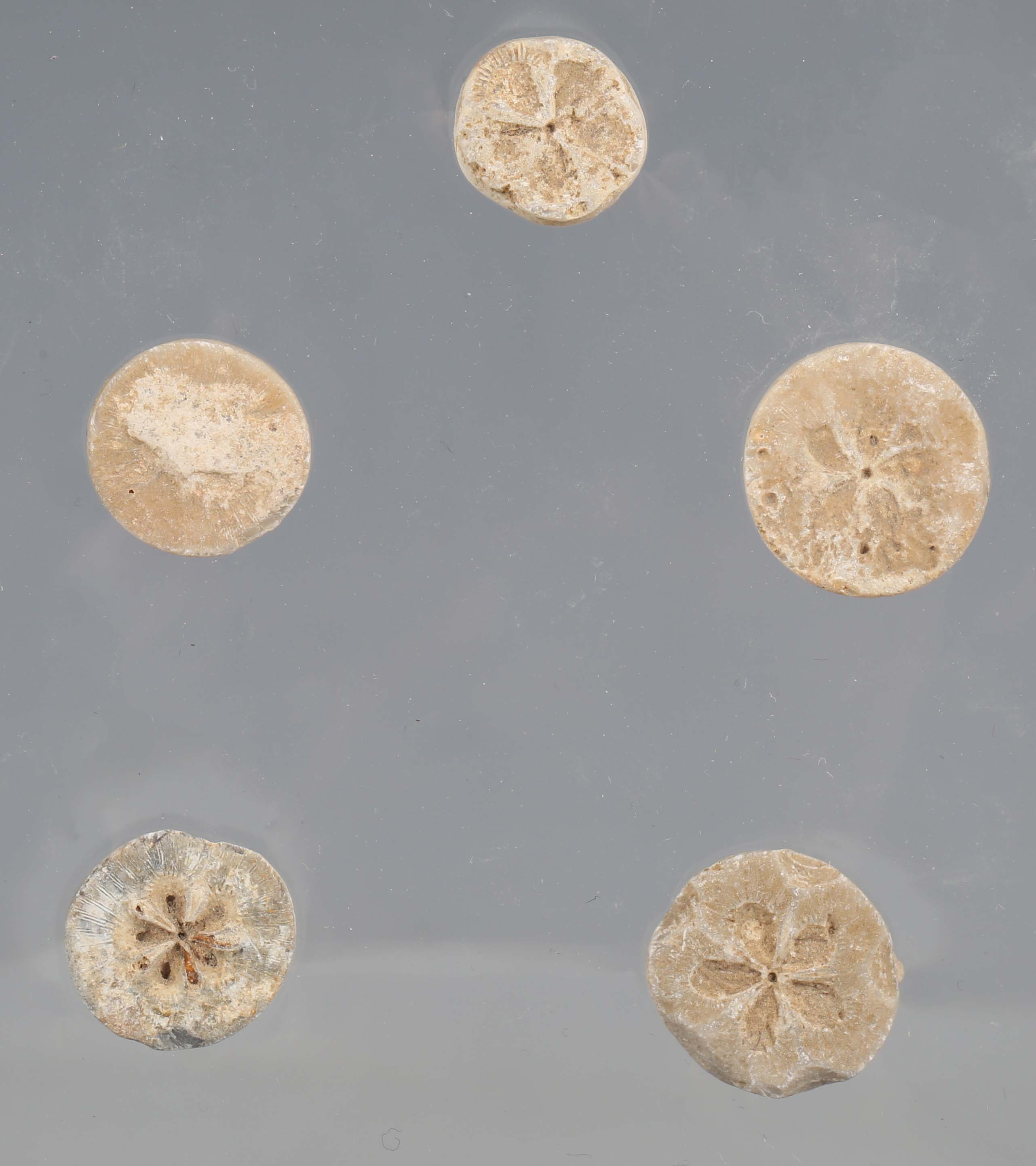 A group of ancient Egyptian steatite inlays of disc form, circa 3rd-1st century BC, all with impressed flowerhead motifs, some composed of a stack of several discs, diameter of largest 1.6cm, mounted within a display stand.