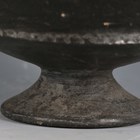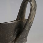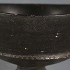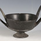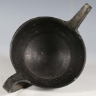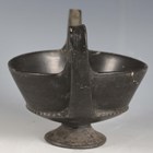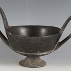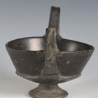 An ancient Etruscan bucchero kantharos, circa 625-550 BC, the circular bowl with twin loop handles and toothed ridge, width 19.5cm (professional restoration to both handles). Provenance: North German private collector.