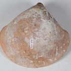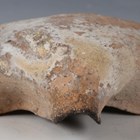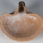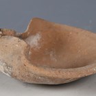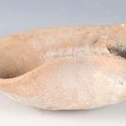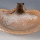 A Canaanite Iron Age terracotta oil lamp of 'cocked hat' form, circa 800-500 BC, width 14cm. Provenance: Paul S. Forbes Collection, Maryland.