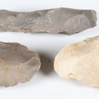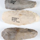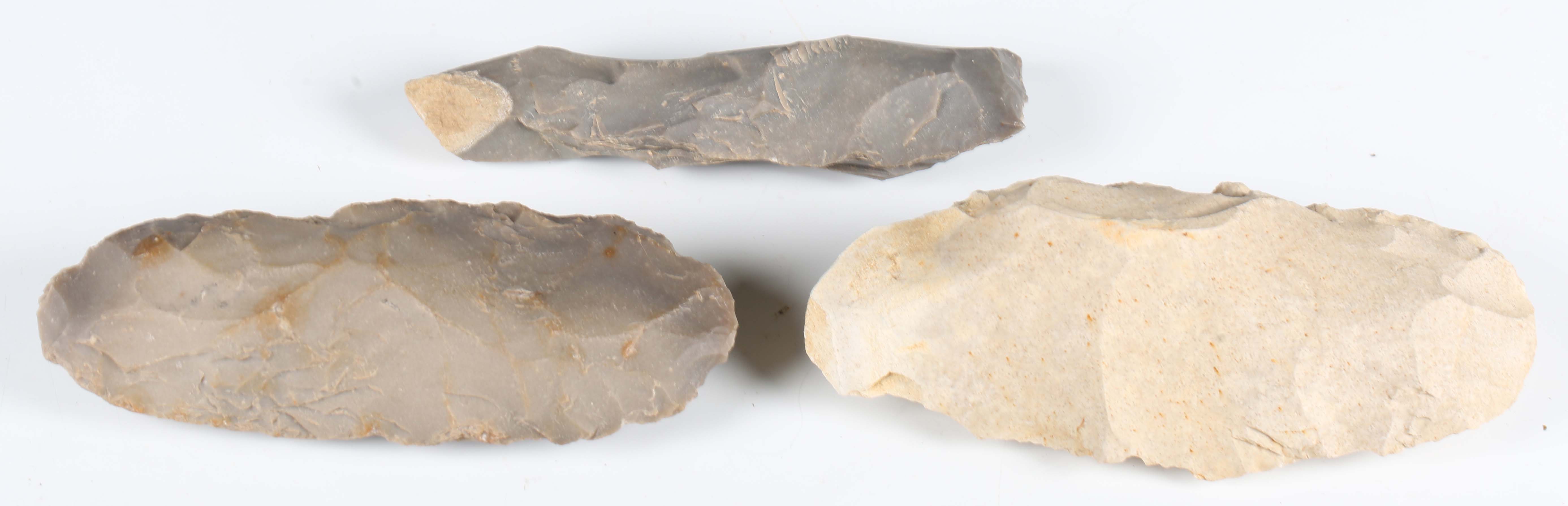 A French Neolithic pale yellow stone axe head, detailed in black ink 'Bretteville Le Radet Axe Head Flint Mines', length 15.5cm, together with two other French Neolithic flint axe heads. Provenance: the estate of a West Sussex collector.