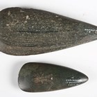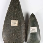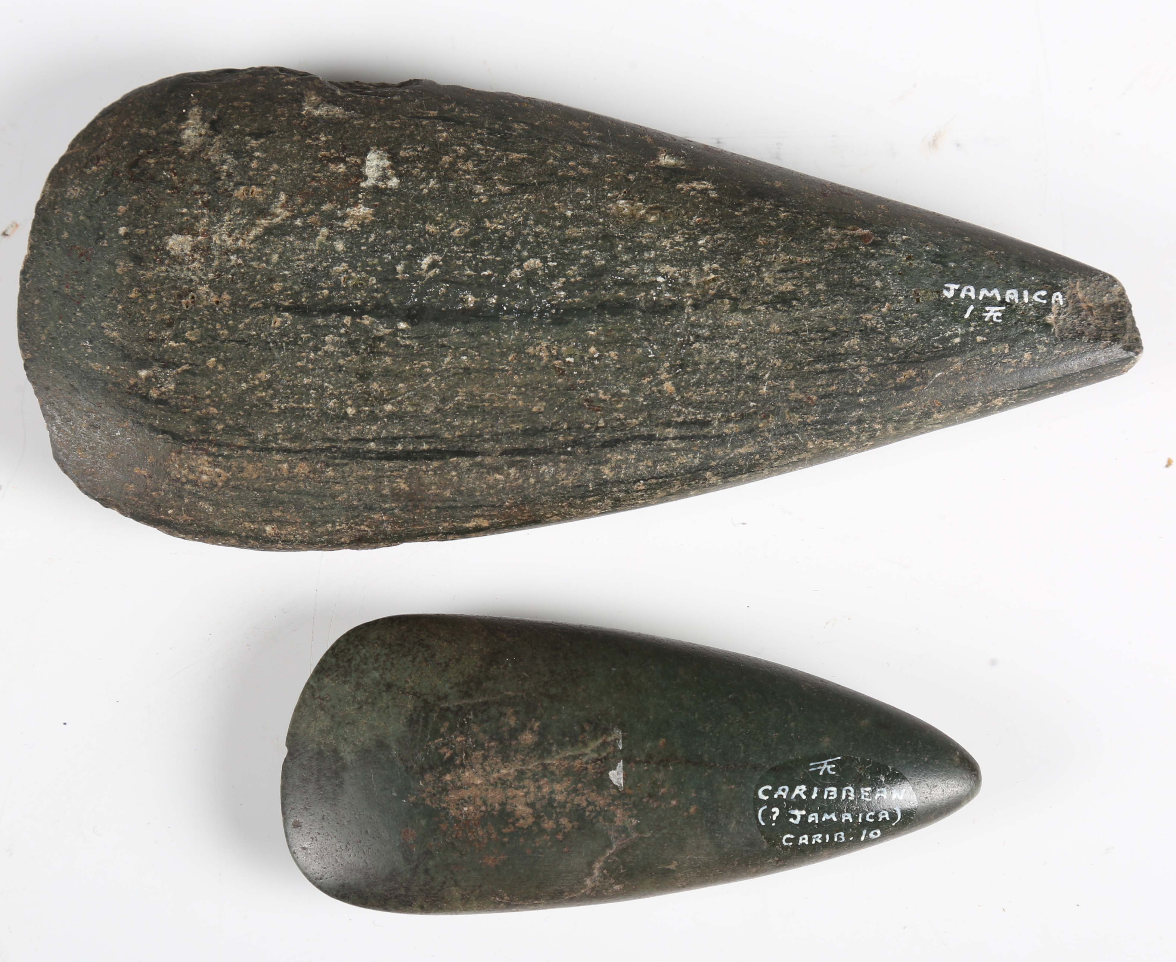 A Jamaican polished stone axe head of flattened ovoid form, bearing 'F.S. Clark Collection' label, detailed 'Jamaican W.Indies', length 15cm, together with a similar smaller axe head, bearing label and inscribed in white ink, length 9cm. Provenance: the estate of a West Sussex collector.