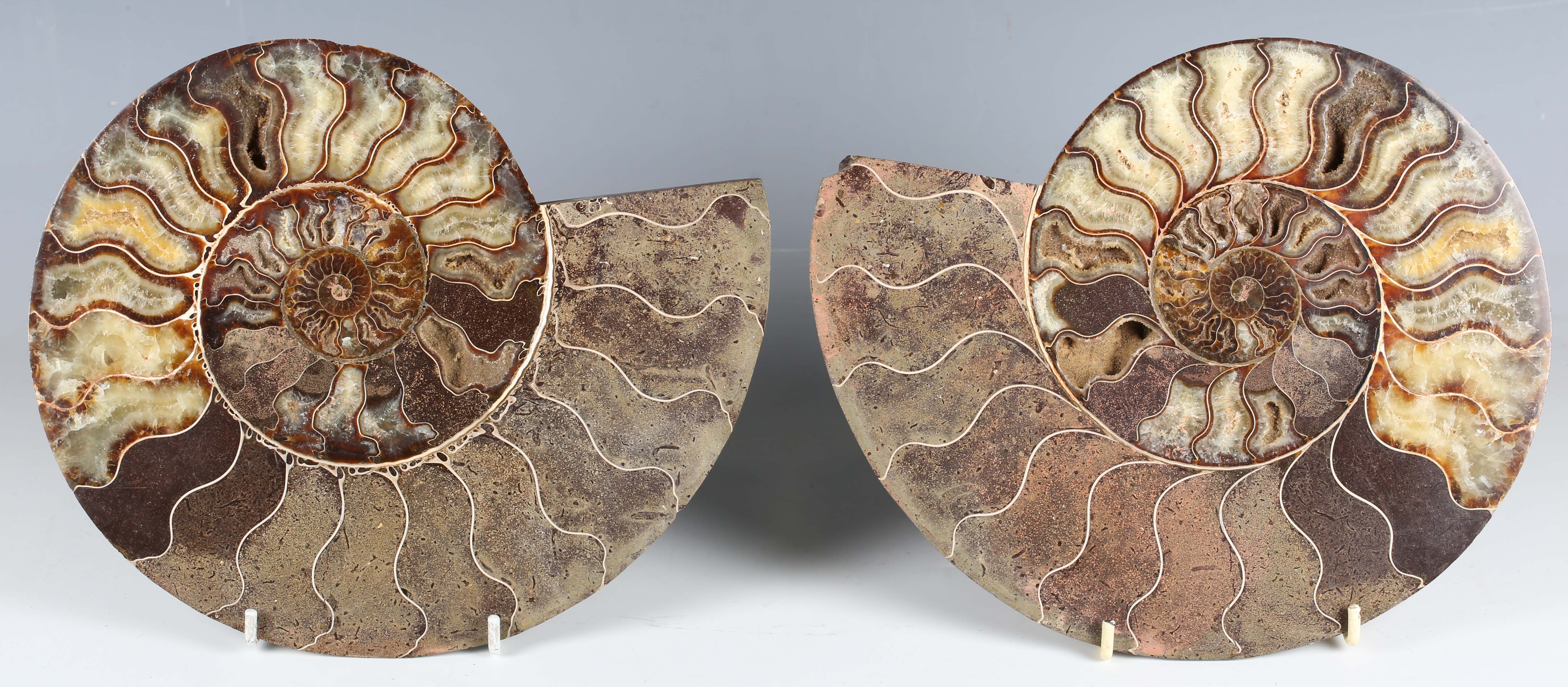 A large pair of split and polished Cleoniceras ammonite specimens, width 25.5cm.