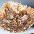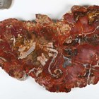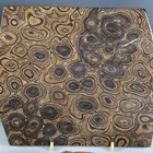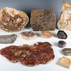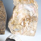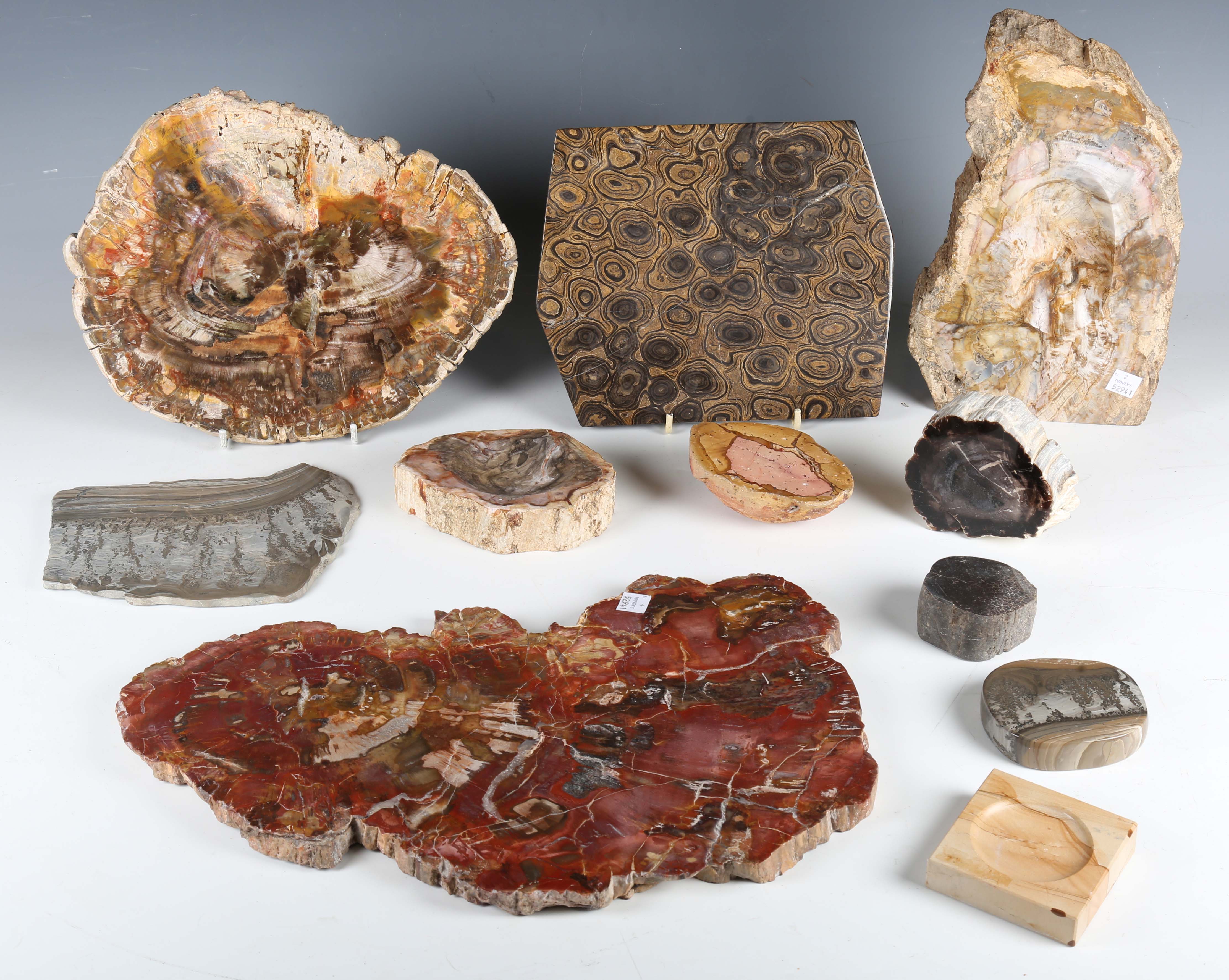A group of fossilized wood specimens, including a large cross section of petrified tree trunk, width 41cm, together with a polished panel of stromatolite and a similar panel of Cotham marble.