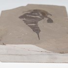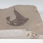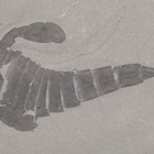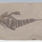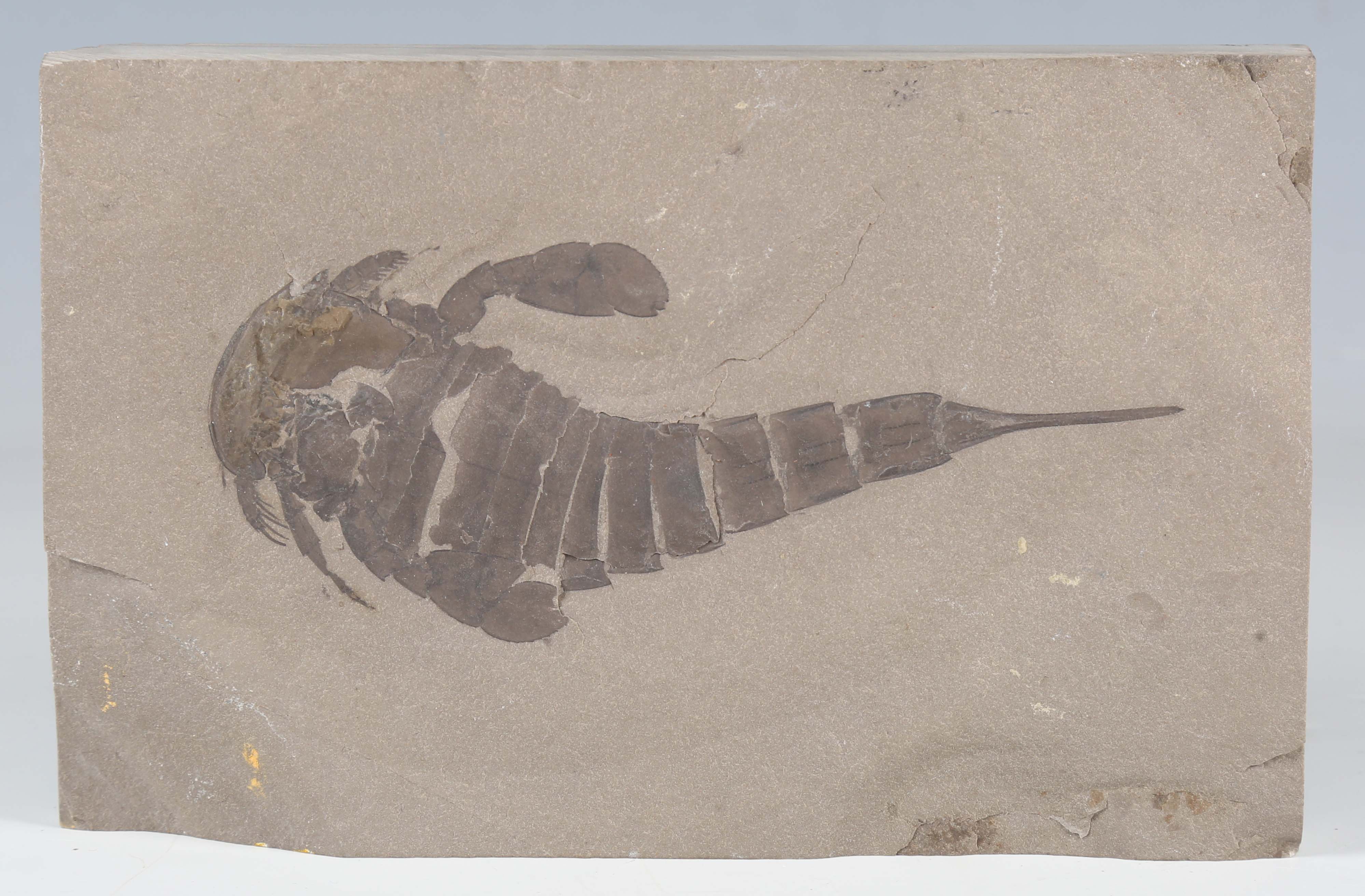A fossil specimen of a sea scorpion, preserved within a panel of grey stone, width 18cm.