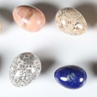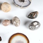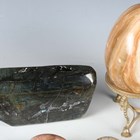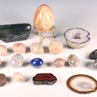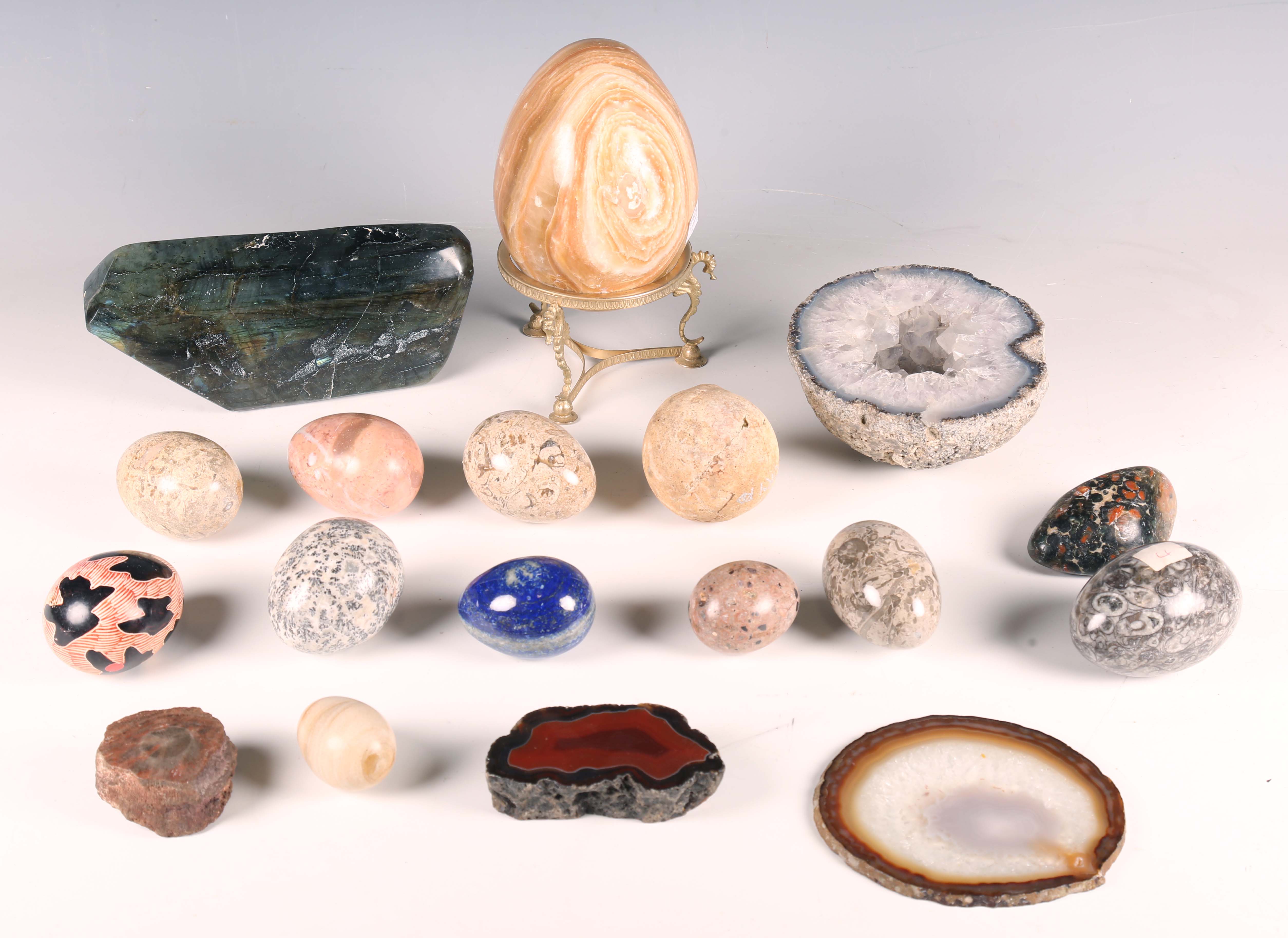 A collection of polished mineral specimens, including a shaped block of labradorite, length 20cm, various eggs and a quartz geode, width 13cm.