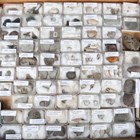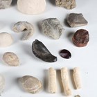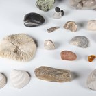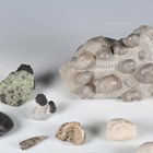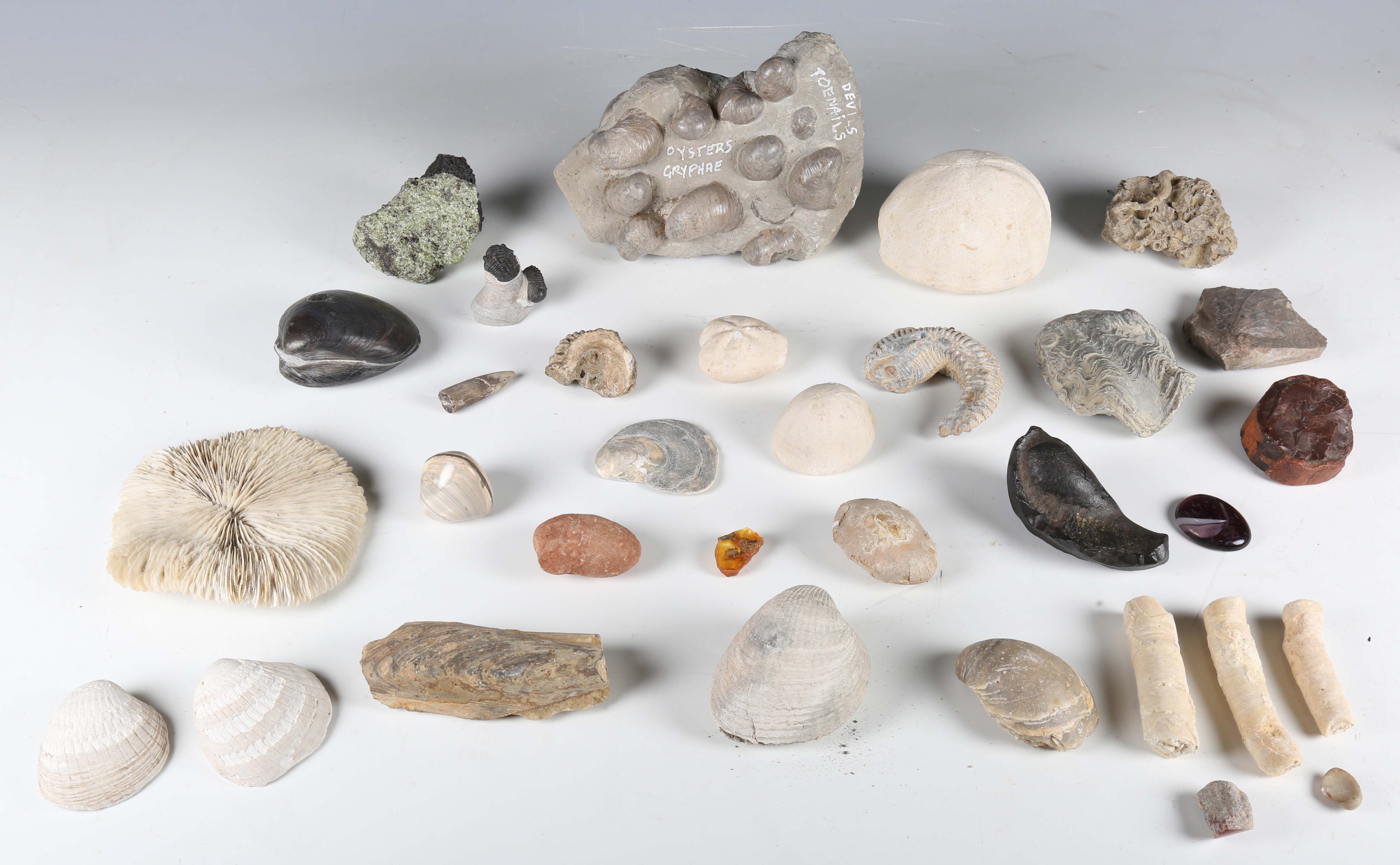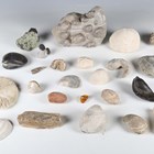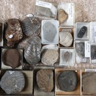 A large collection of fossil specimens, including sea urchins, halysites and heliotites.