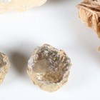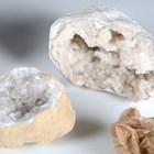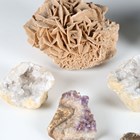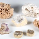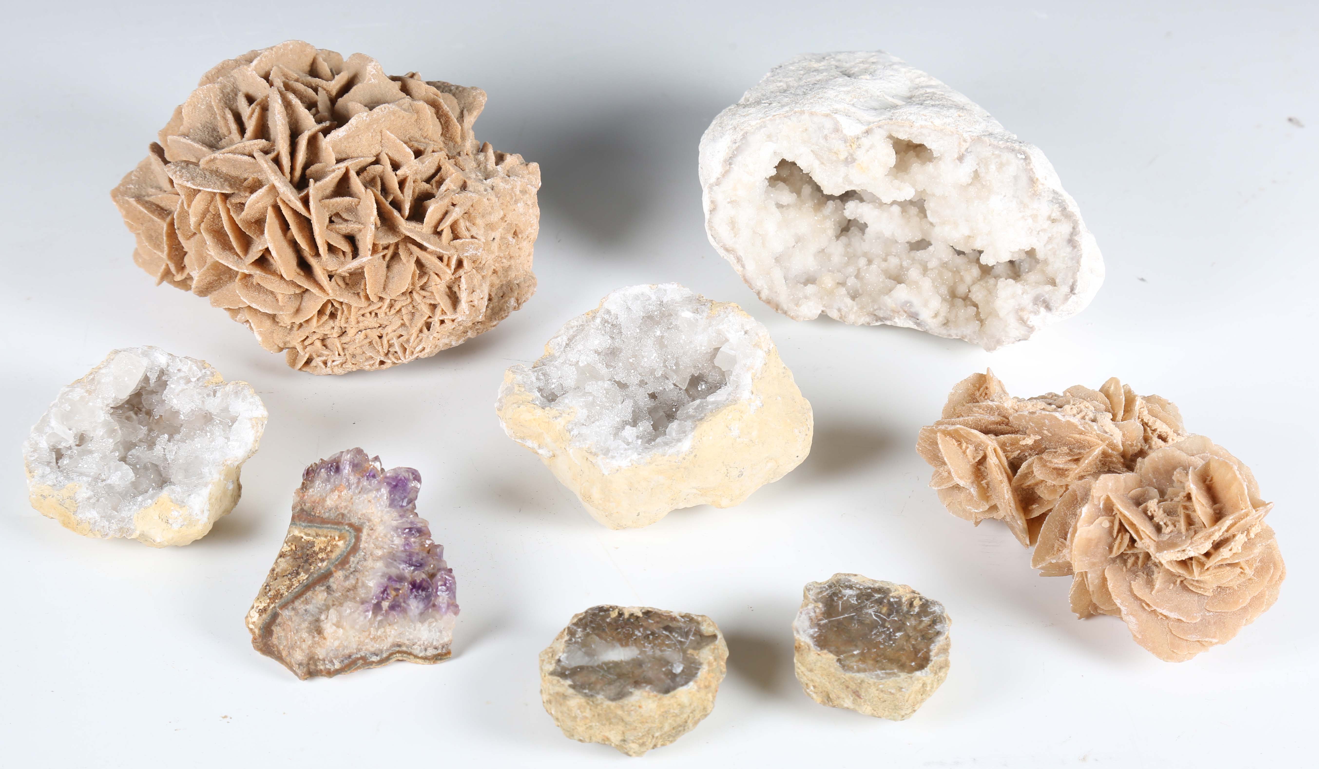 A small group of mineral specimens, including desert rose, length 13cm, a split quartz geode, another half geode, amethyst and two pieces of muscovite.