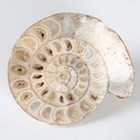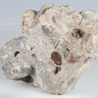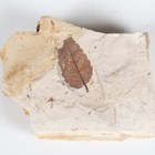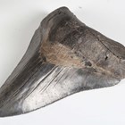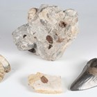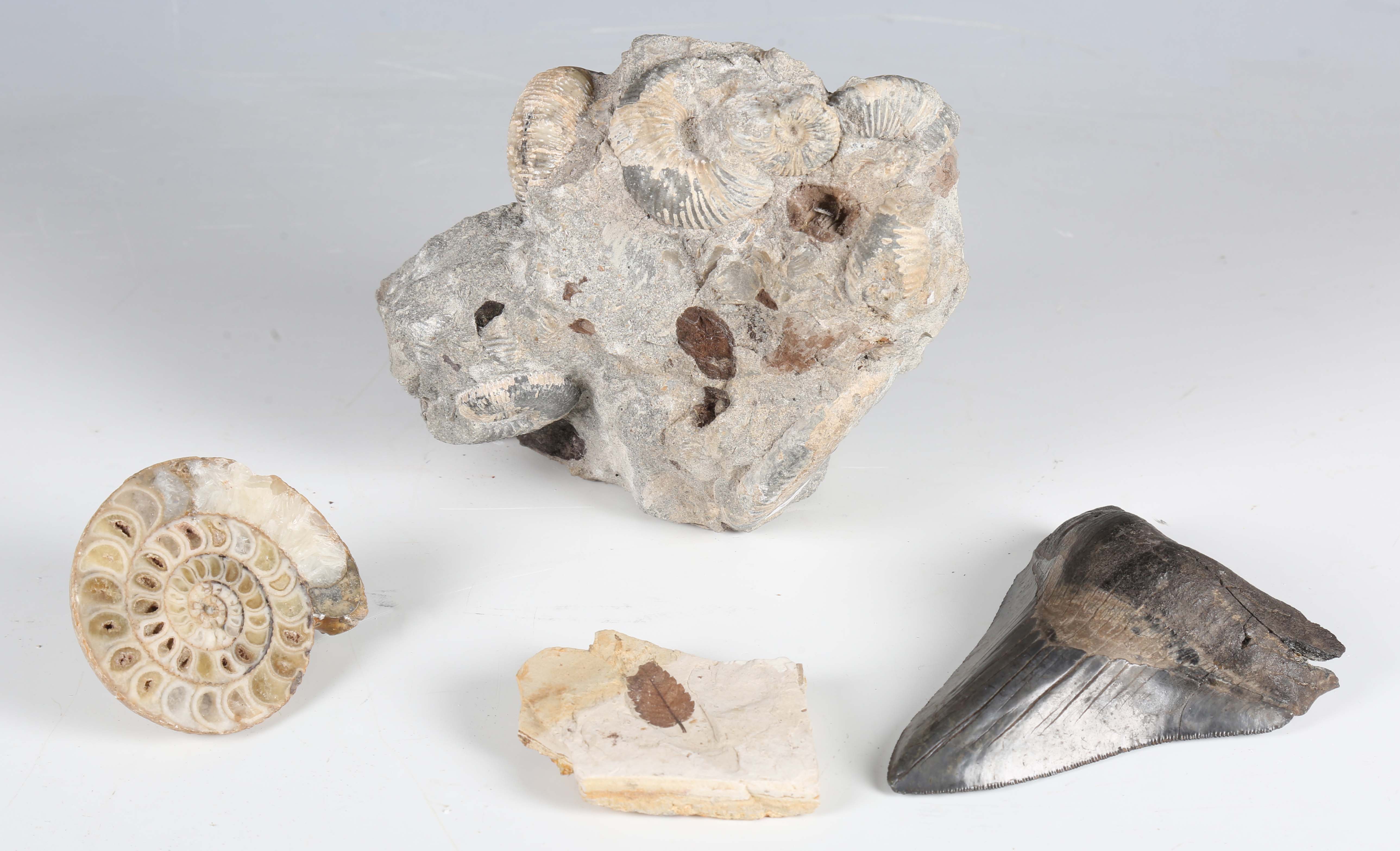 A fossil specimen of a megalodon tooth, length 11.5cm, together with a rock bed of ammonites, width 16cm, another ammonite and a leaf specimen.