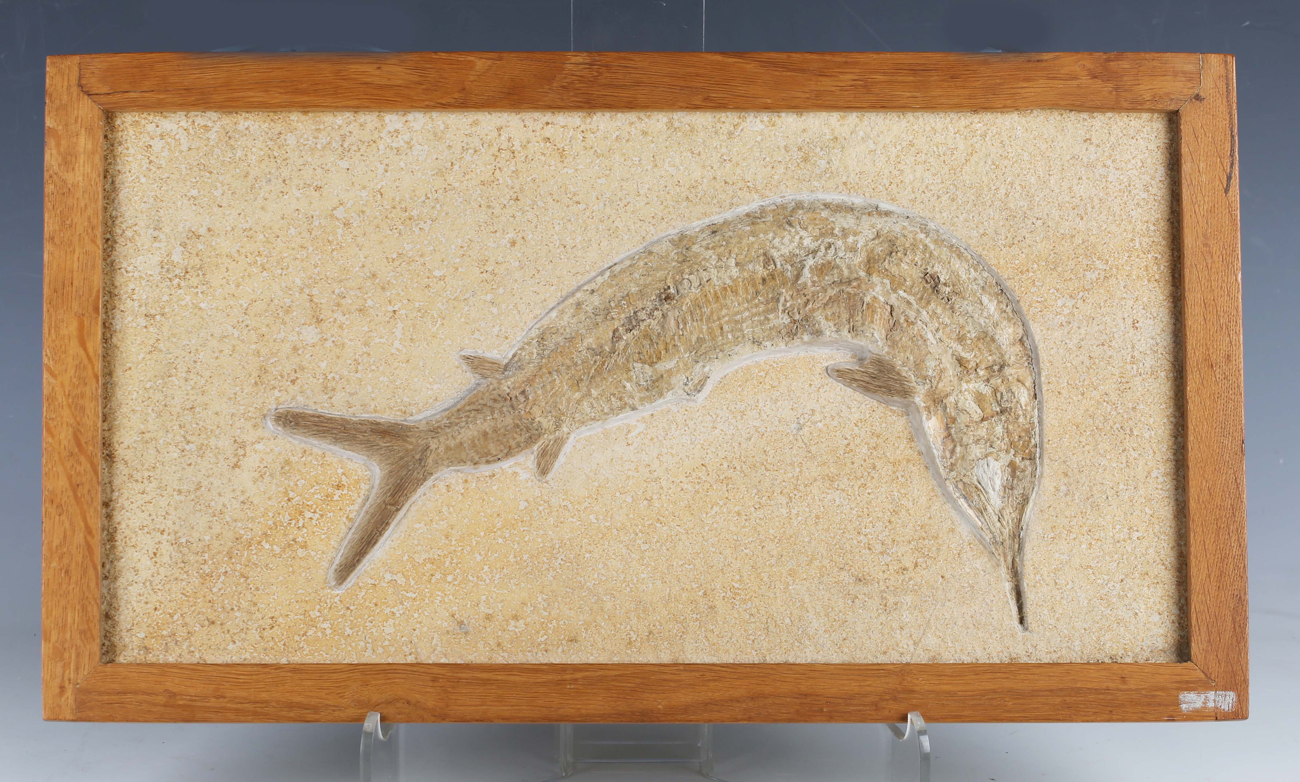 A large fossil specimen of an Aspidorhynchus fish, Eichstatt, Germany, 47cm x 24cm, mounted within an oak frame.