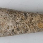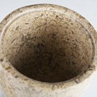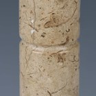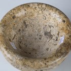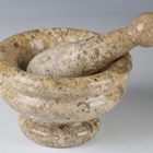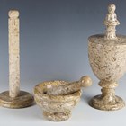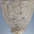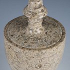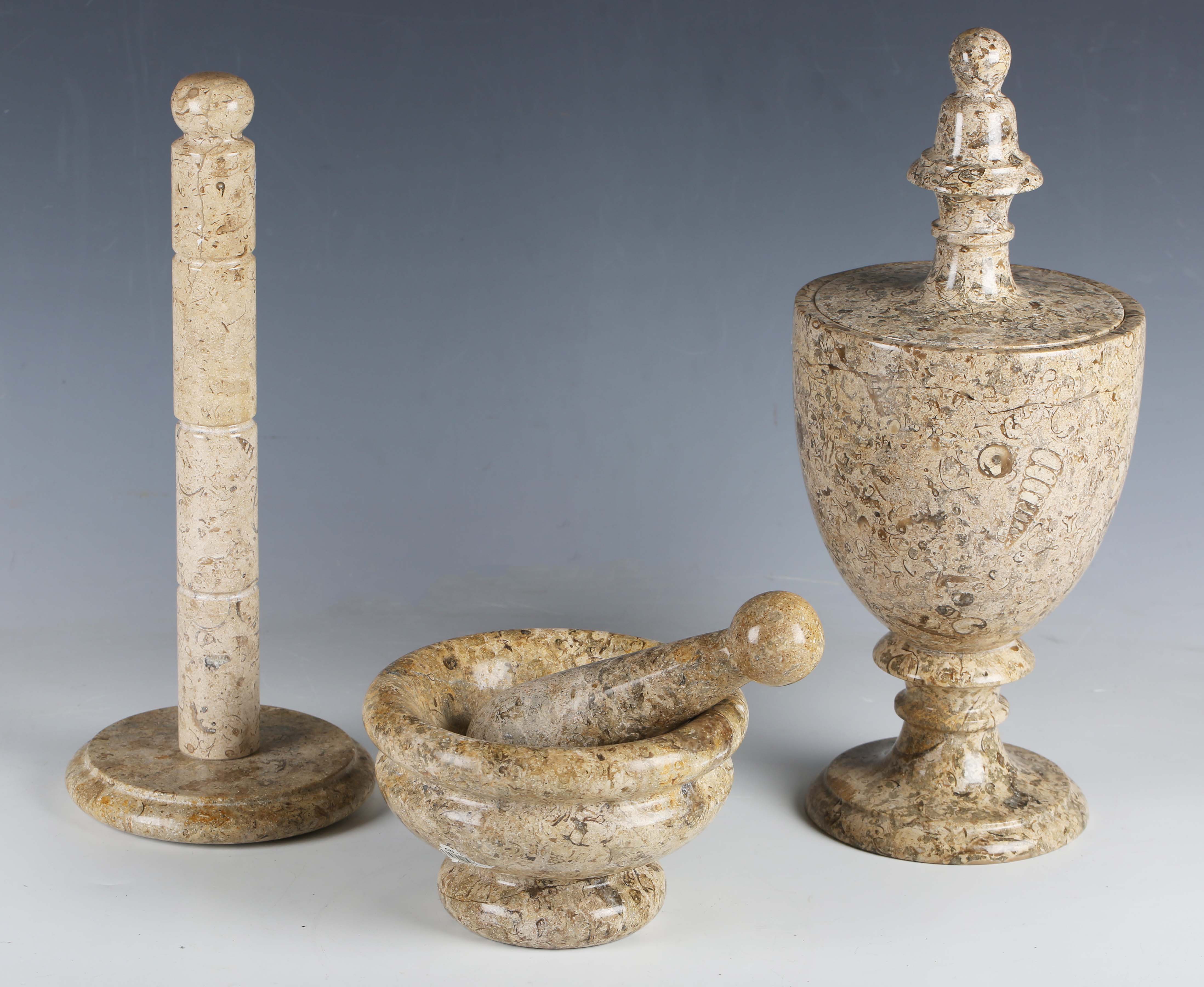 A group of turned and polished fossil stone kitchenalia, comprising a storage goblet, height 36cm, a pestle and mortar and a kitchen roll holder.
