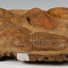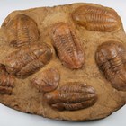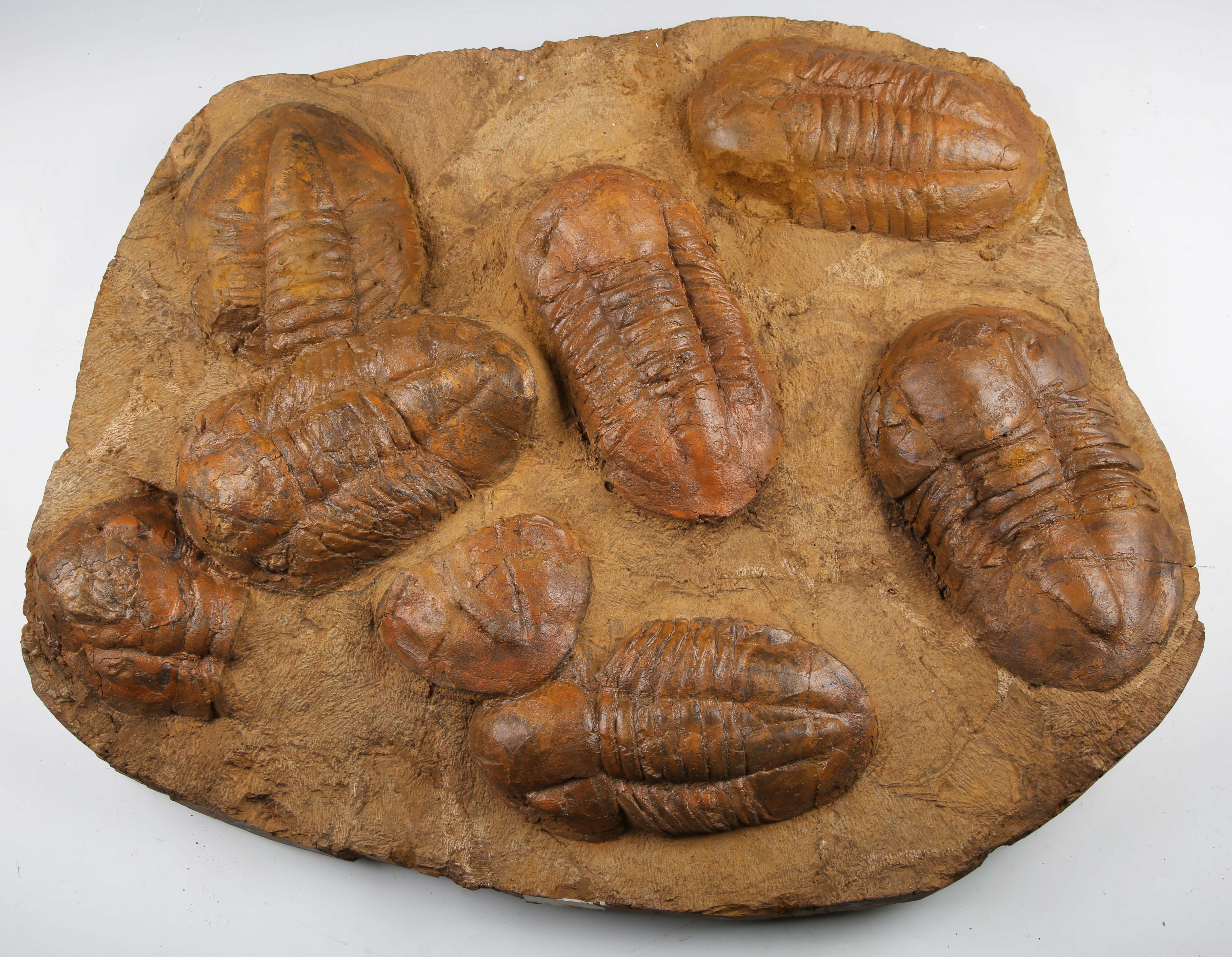 A large plaque of multiple trilobite fossil specimens, 68cm x 58cm (partly reconstructed).