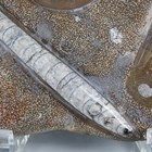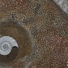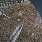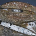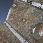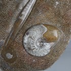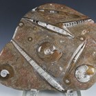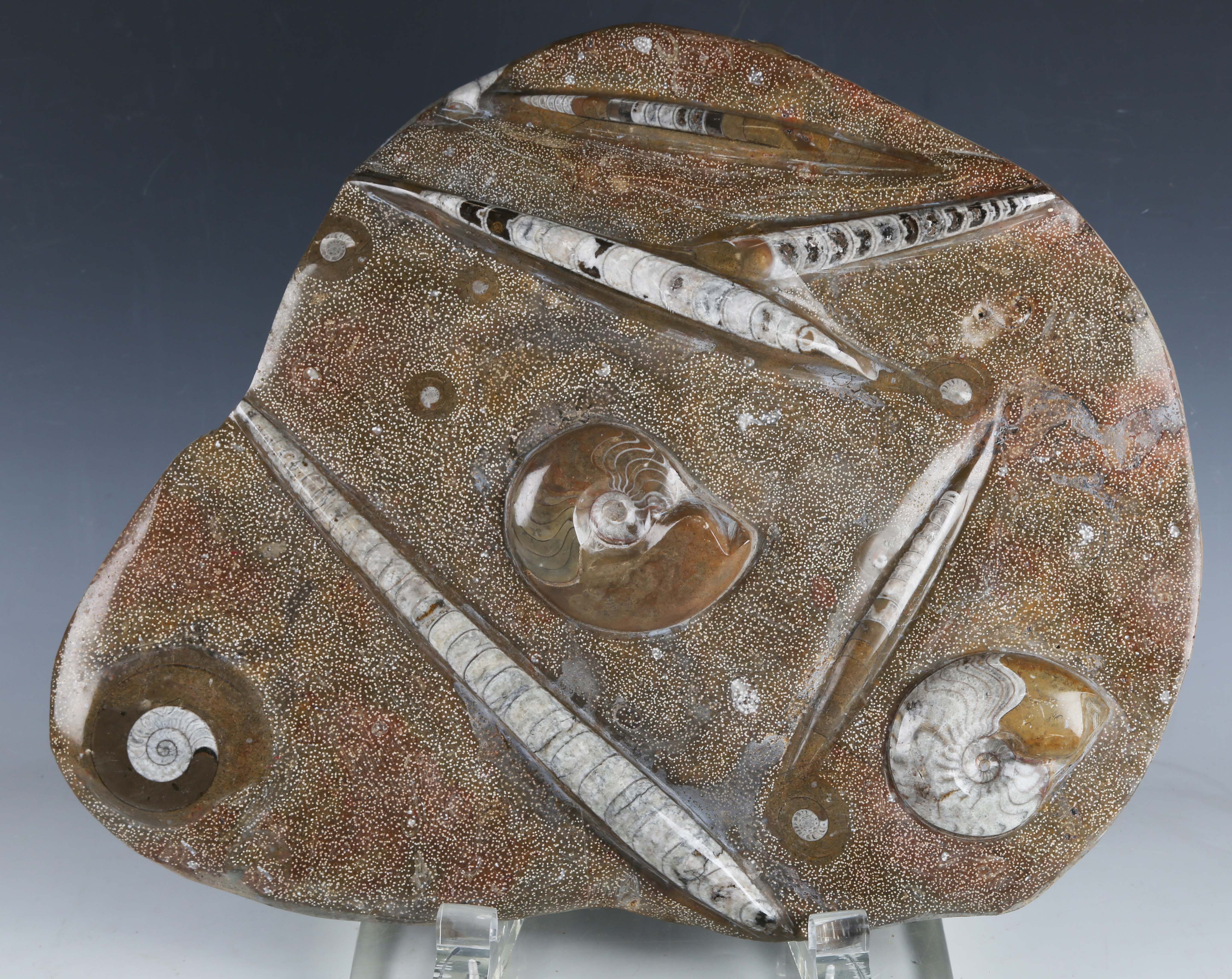 A large polished fossil plaque, containing ammonite and orthoceras specimens, 53cm x 43cm.
