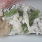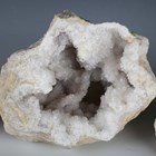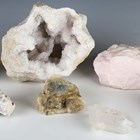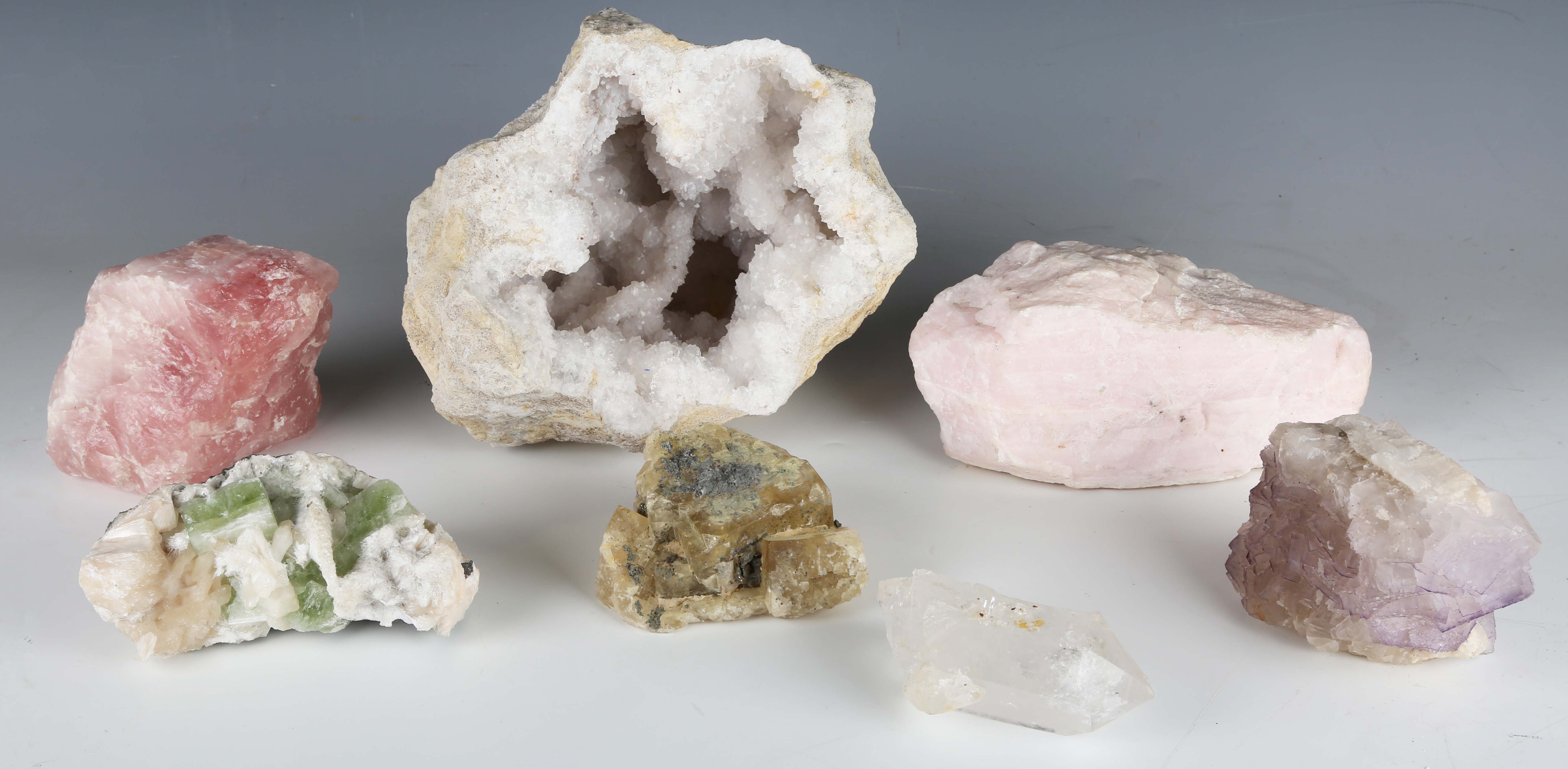 A large quartz geode, height 23cm, and six other mineral specimens, including pink quartz, amethyst and apophyllite.