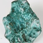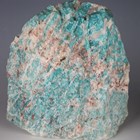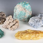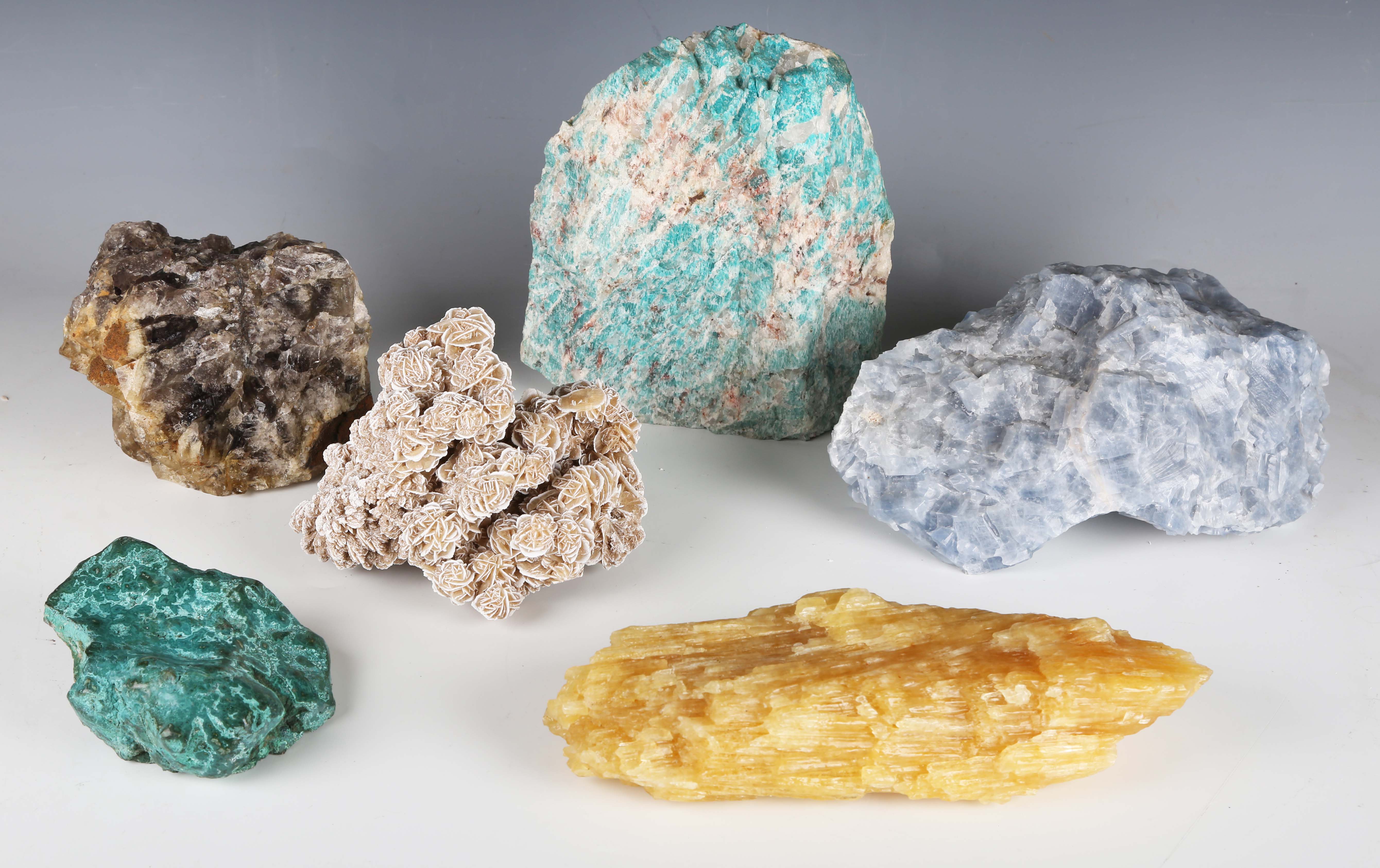 A group of six mineral specimens, including a desert rose formation, width 18cm, amazonite, aragonite, length 29cm, blue calcite and malachite.