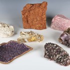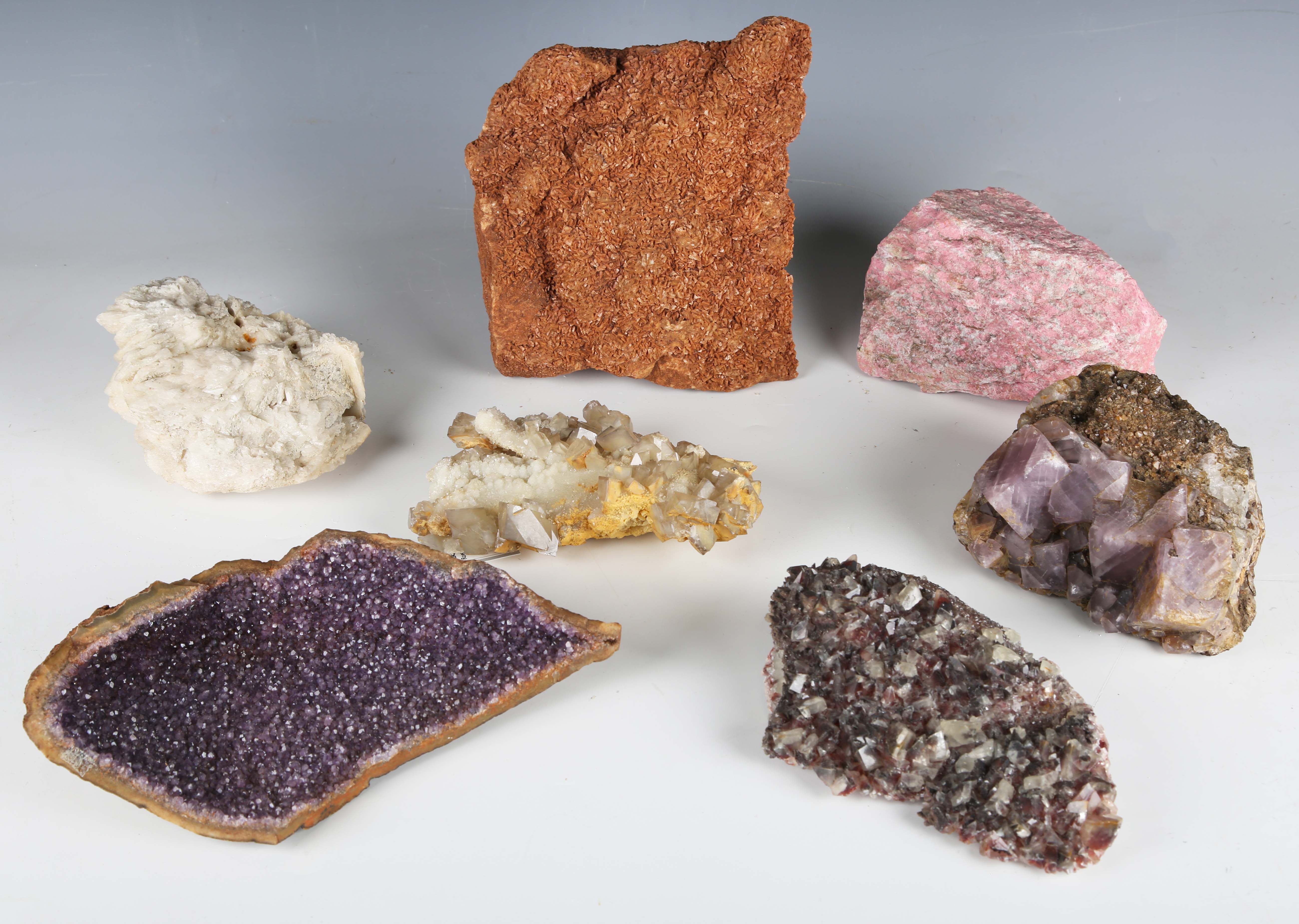 A group of seven mineral specimens, including a formation of amethyst crystal, width 26cm, calcite, barite and Cumbrian dolomite.