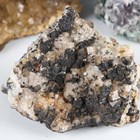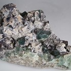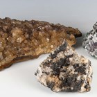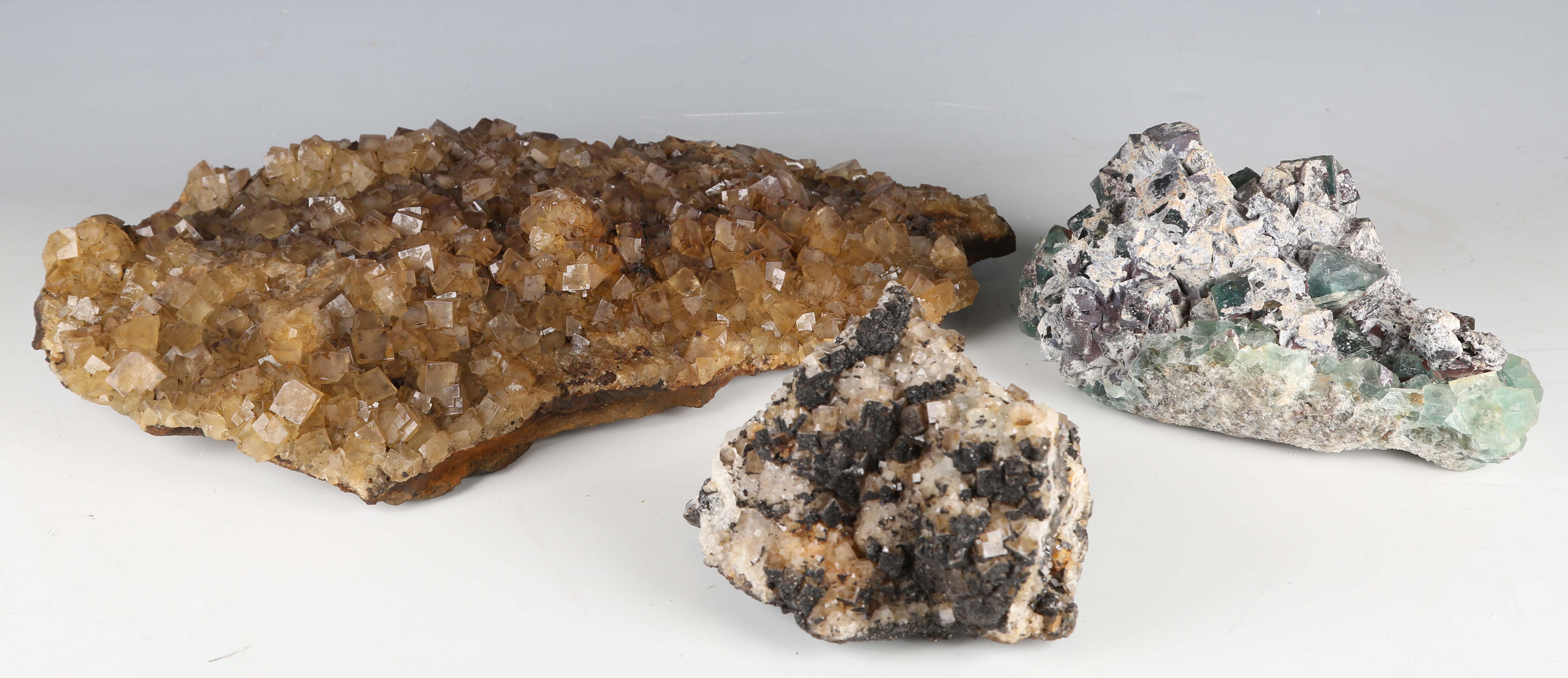 A large fluorite specimen, length 49cm, a green fluorite specimen, width 28cm, and another mineral formation containing fluorite and sphalerite.
