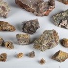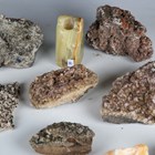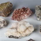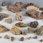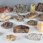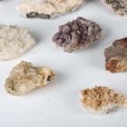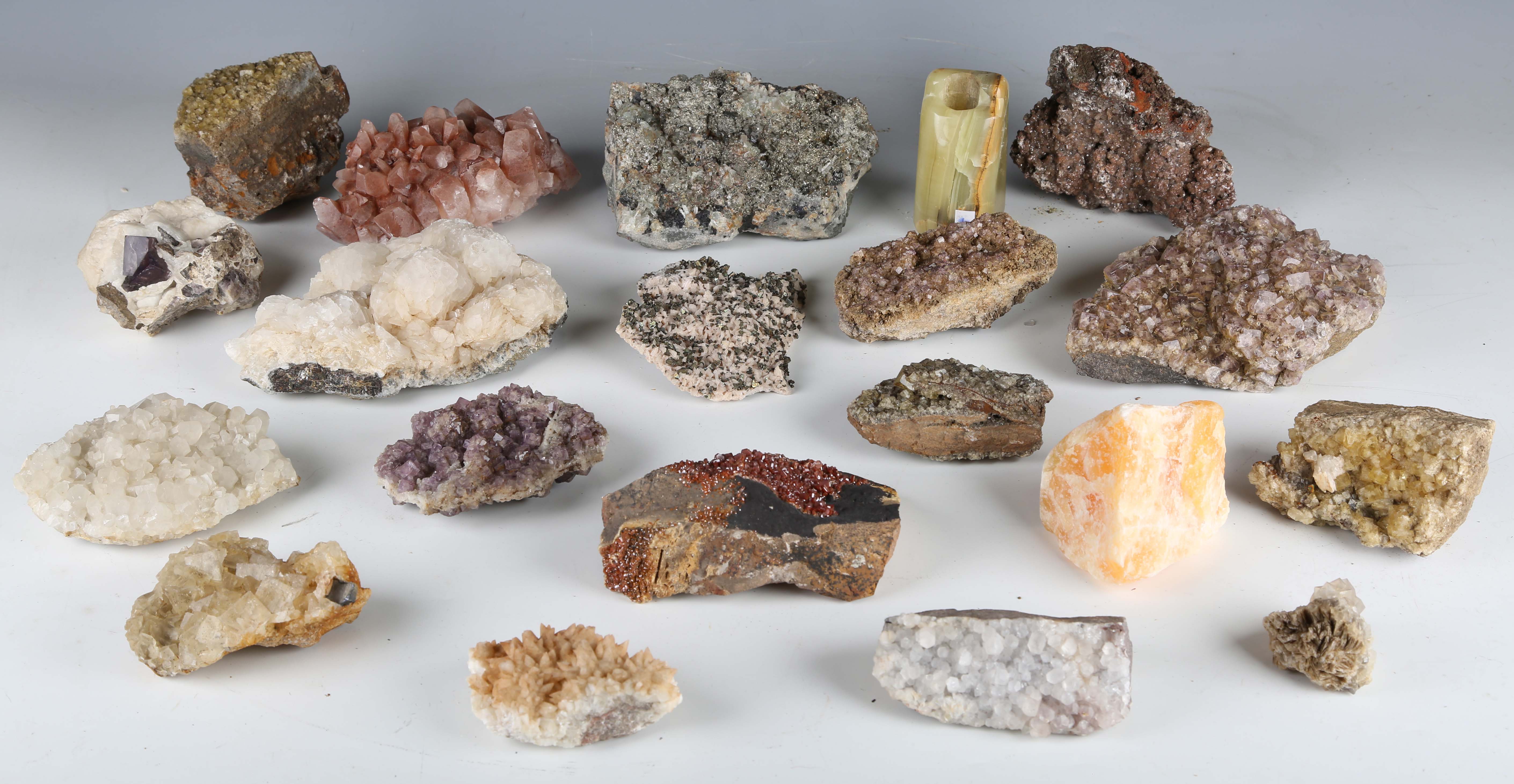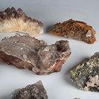 A collection of mineral specimens, including calcites from the Heights Mine and Cambokeels Mine, purple fluorites from Alston Moor in Cumbria and Lonehead Mine, Weardale, and other quartz formations.