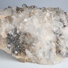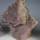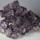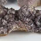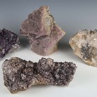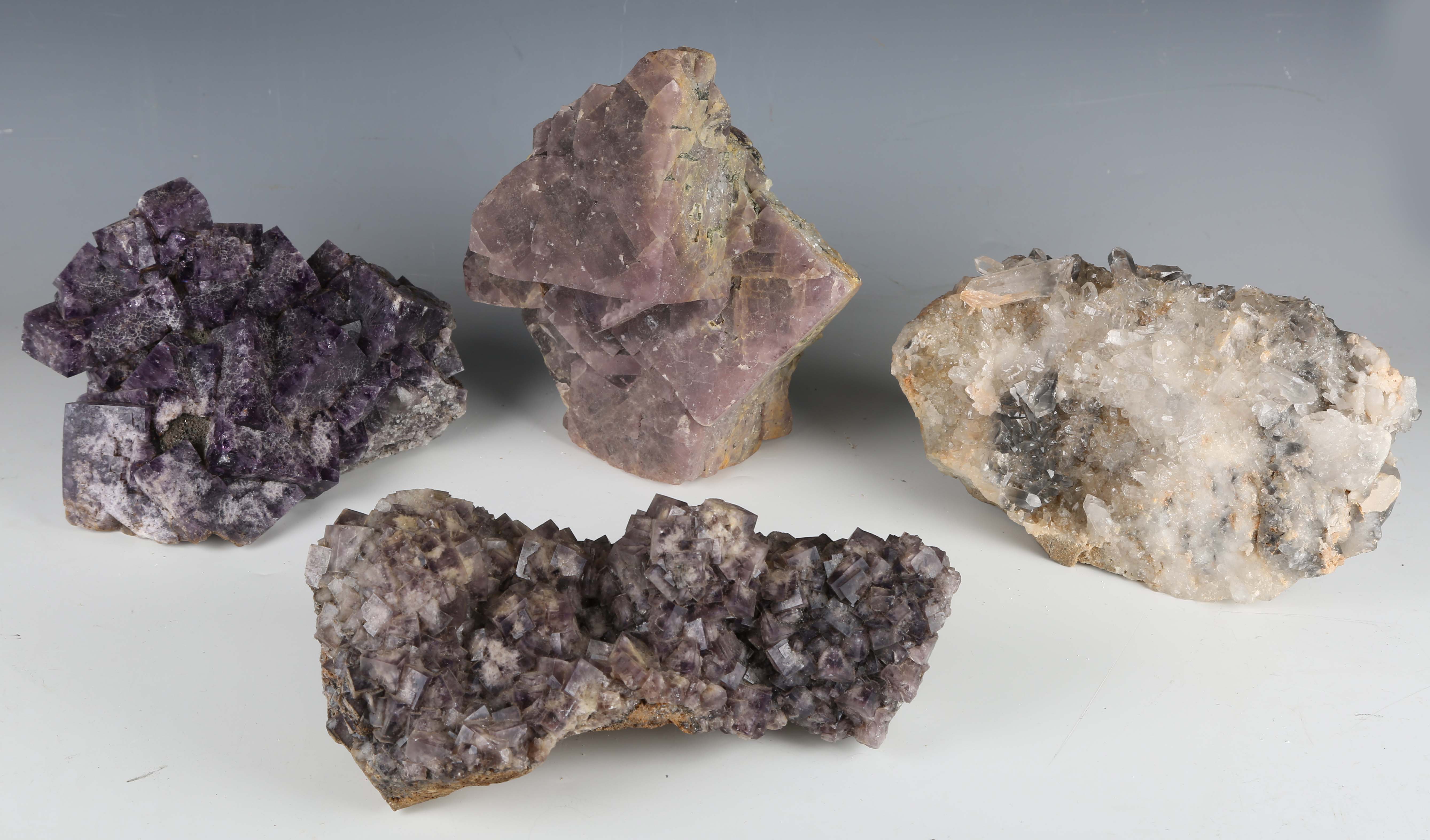A group of four large mineral specimens, comprising purple fluorite from Frazer's Hush Mine, County Durham, height 26cm, another specimen of purple fluorite from Greenlaws Mine, another fluorite crystal formation, and a celestine specimen.