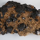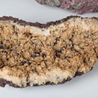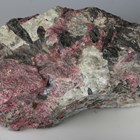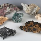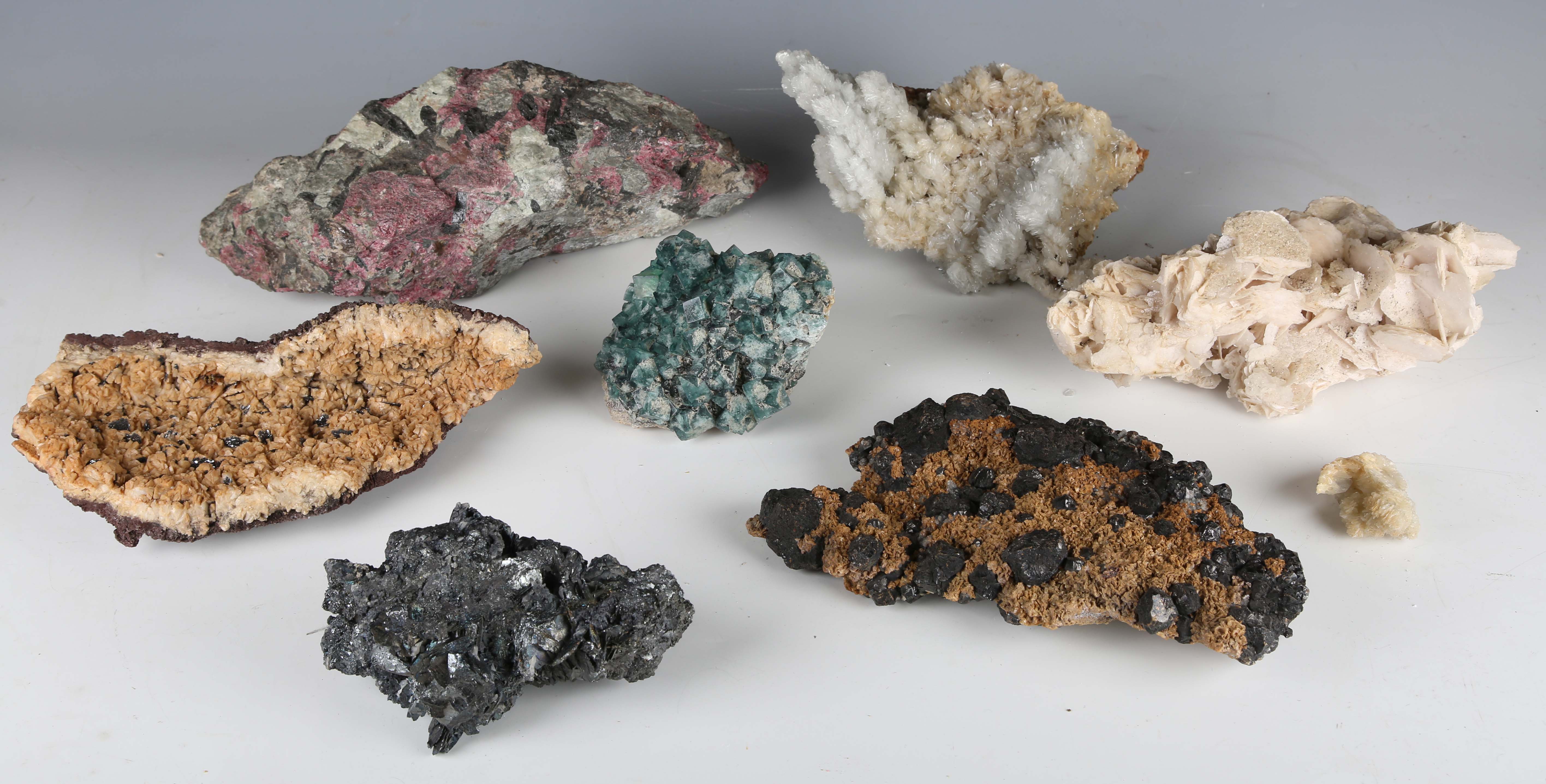 A group of mineral specimens, including galena with sphalerite, width 28cm, eudialyte, length 35cm, and a fluorite crystal formation.