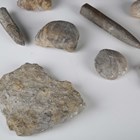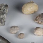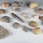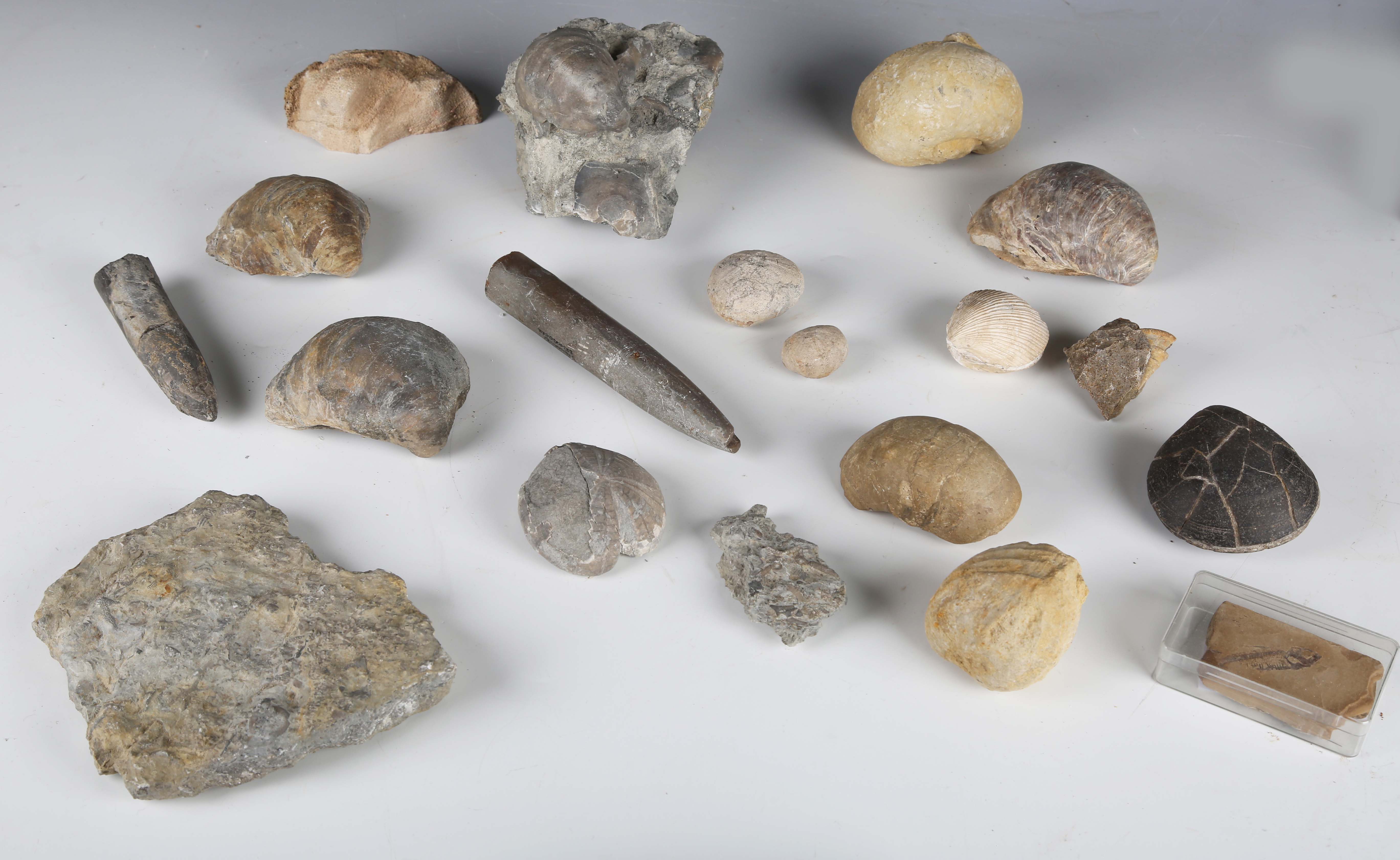 A collection of various fossil specimens, including approximately 39 echinoids from the Sussex South Downs, other echinoids from Denmark, a belemnite specimen, detailed 'Oxford Clay', length 15cm, two nautilus shells and other sea life.