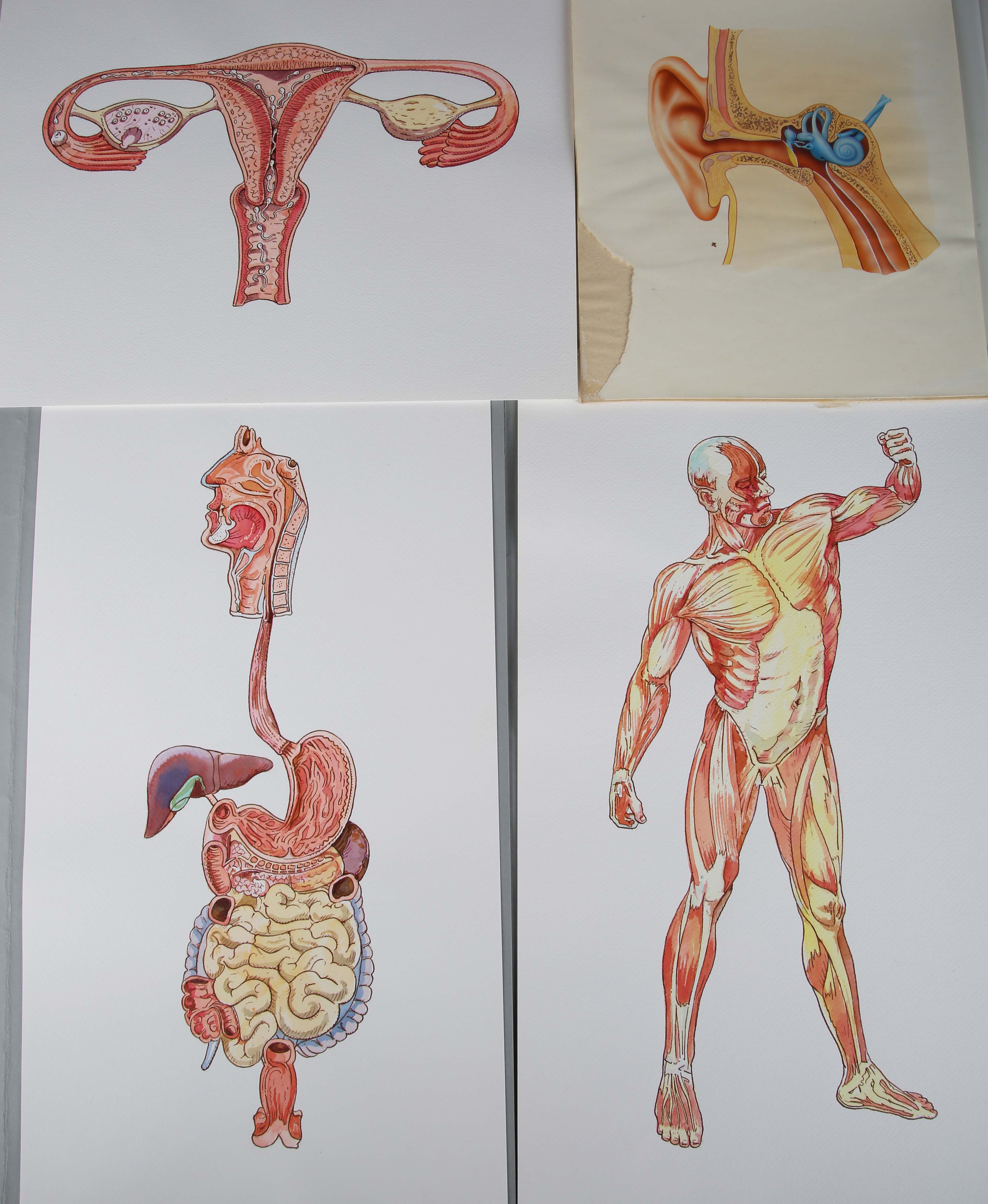 A group of eight late 20th century anatomical watercolour studies of the human body and organs, probably produced for a South African publication, the outer folders detailed as the folders are detailed in Afrikaans.