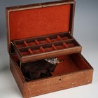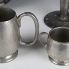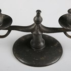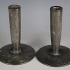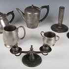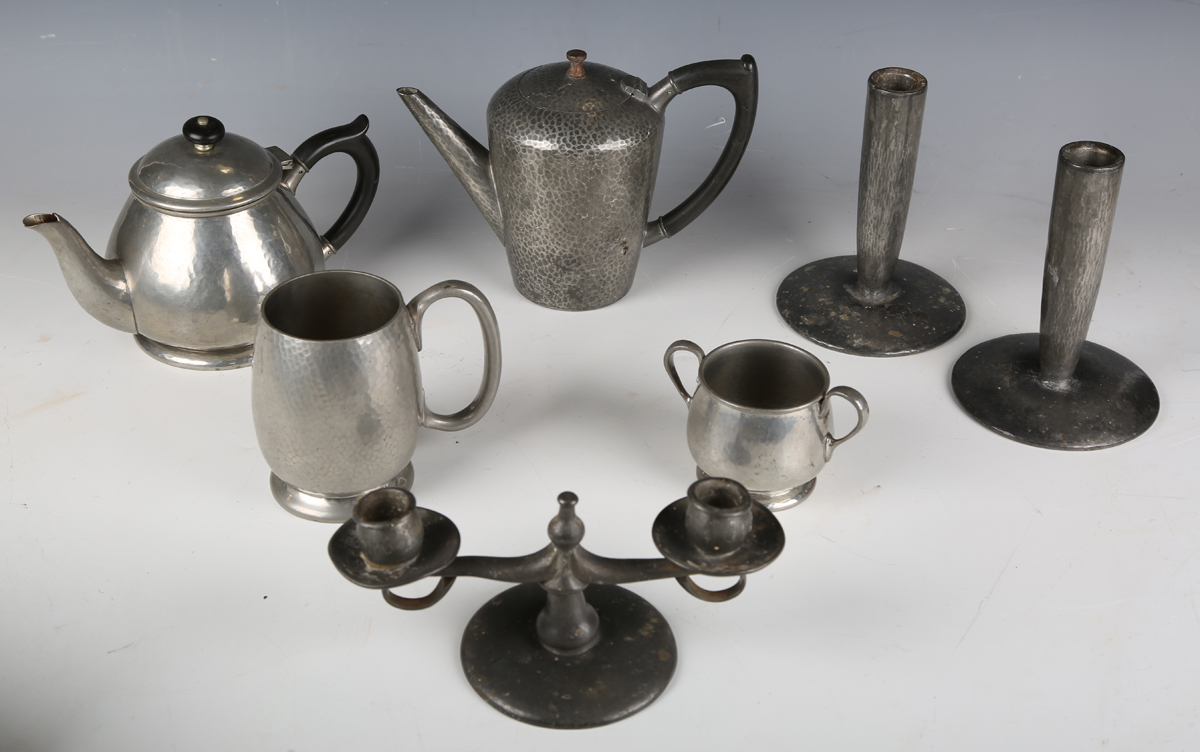 A pair of Liberty & Co 'Tudric' pewter candlesticks, model number '0871', height 16.5cm, together with a 'Tudric' pewter twin-light candelabrum, model number '0174', a small amount of other Tudric and a leather jewellery box.