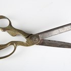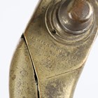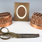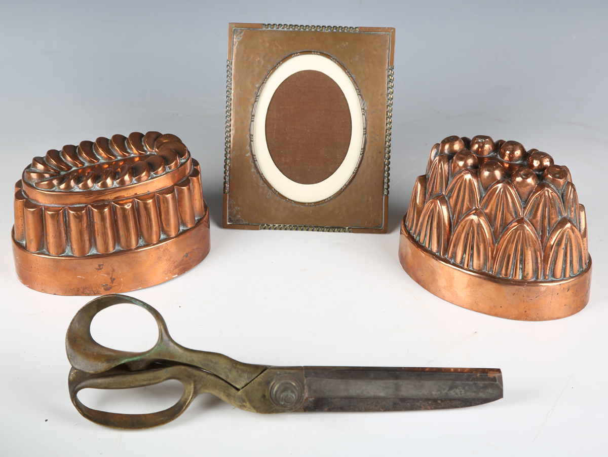 A Victorian copper jelly mould by Benham & Froud, numbered '106', width 17cm, another Benham & Froud jelly mould, numbered '98', width 17cm, a pair of brass dressmaker's shears and an Arts and Crafts copper photograph frame.