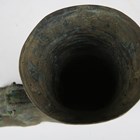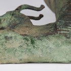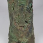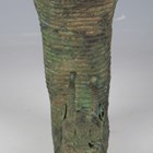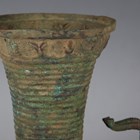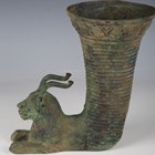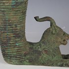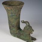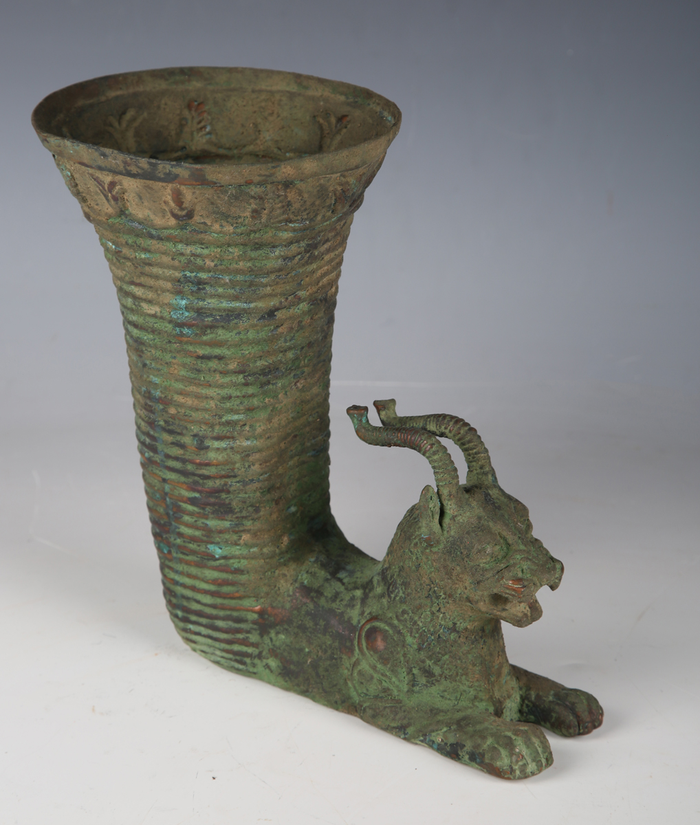 A Bactrian style green patinated copper rhyton drinking vessel, modelled as a ribbed trumpet with horned beast base, height 21.5cm.