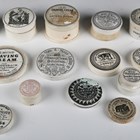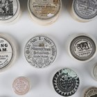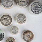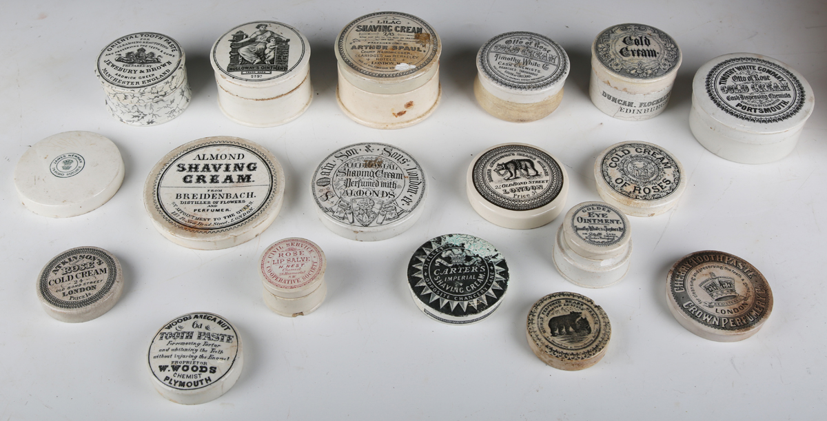 A collection of Victorian glazed ceramic pot lids, all bearing printed advertising for various ointments, creams and pastes (some reproductions).
