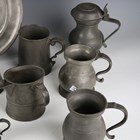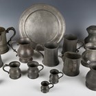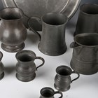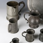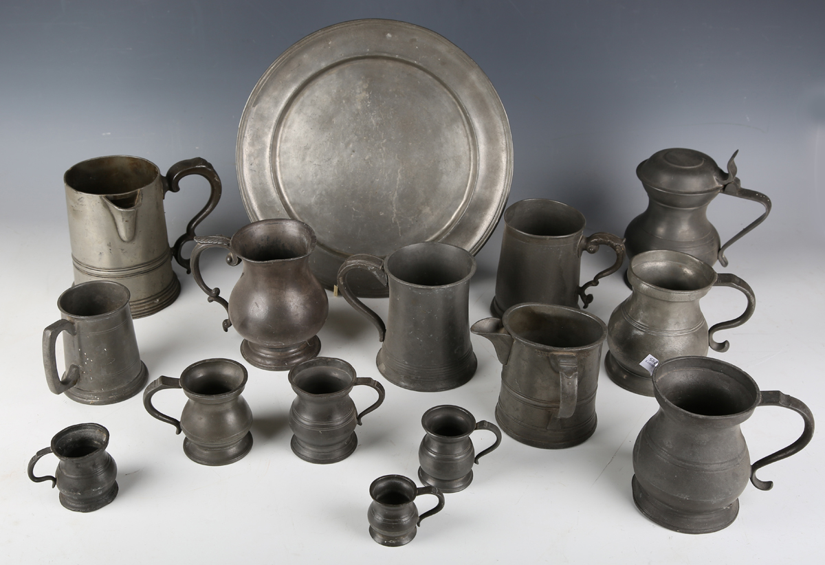 A group of mainly 19th century pewter items, including a plate, tankards and measures.