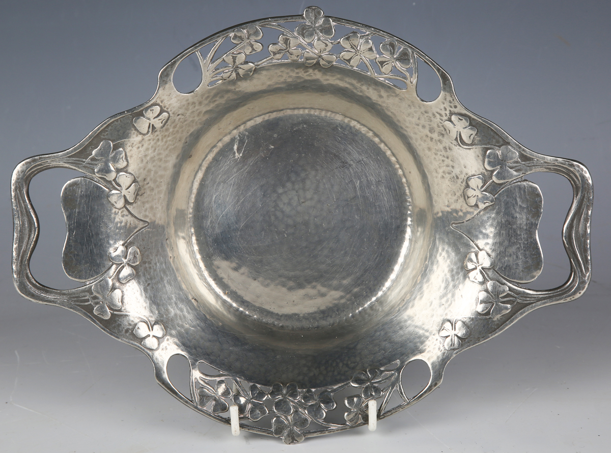A Liberty & Co 'Tudric' pewter two-handled dish, model number '0287', the rim cast with trailing clover, width 28.5cm.