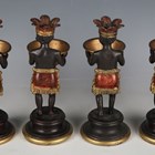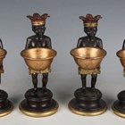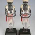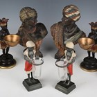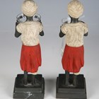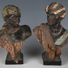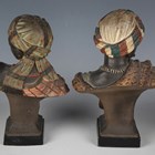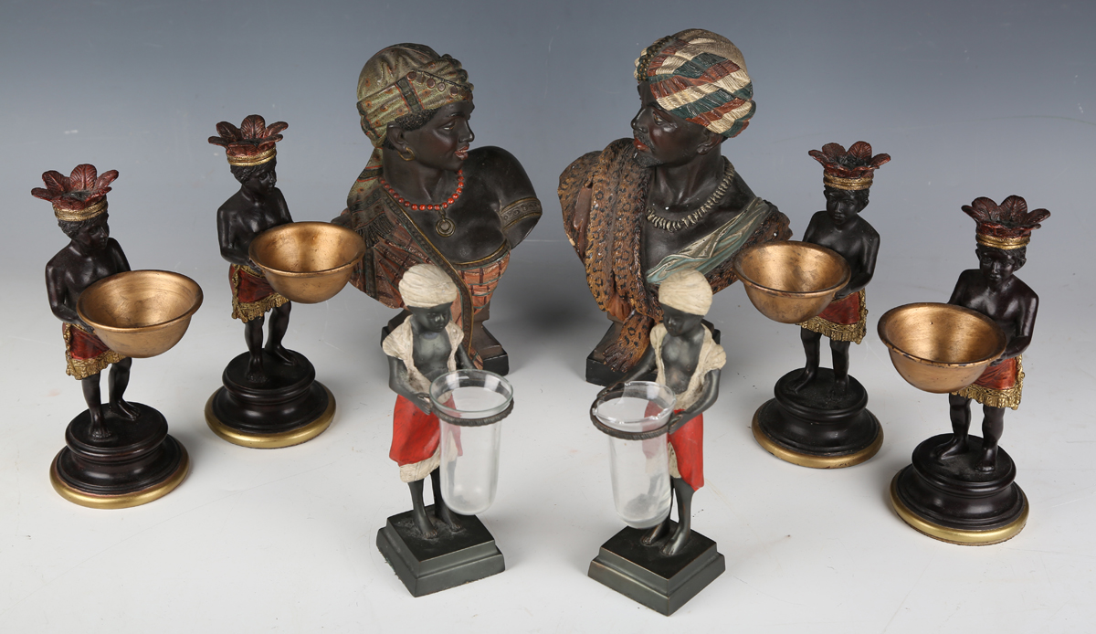 A pair of early 20th century Austrian cold painted terracotta head and shoulders portrait busts of an Arabian lady and gentleman, height 24cm, together with three pairs of modern figural stands.