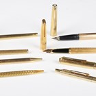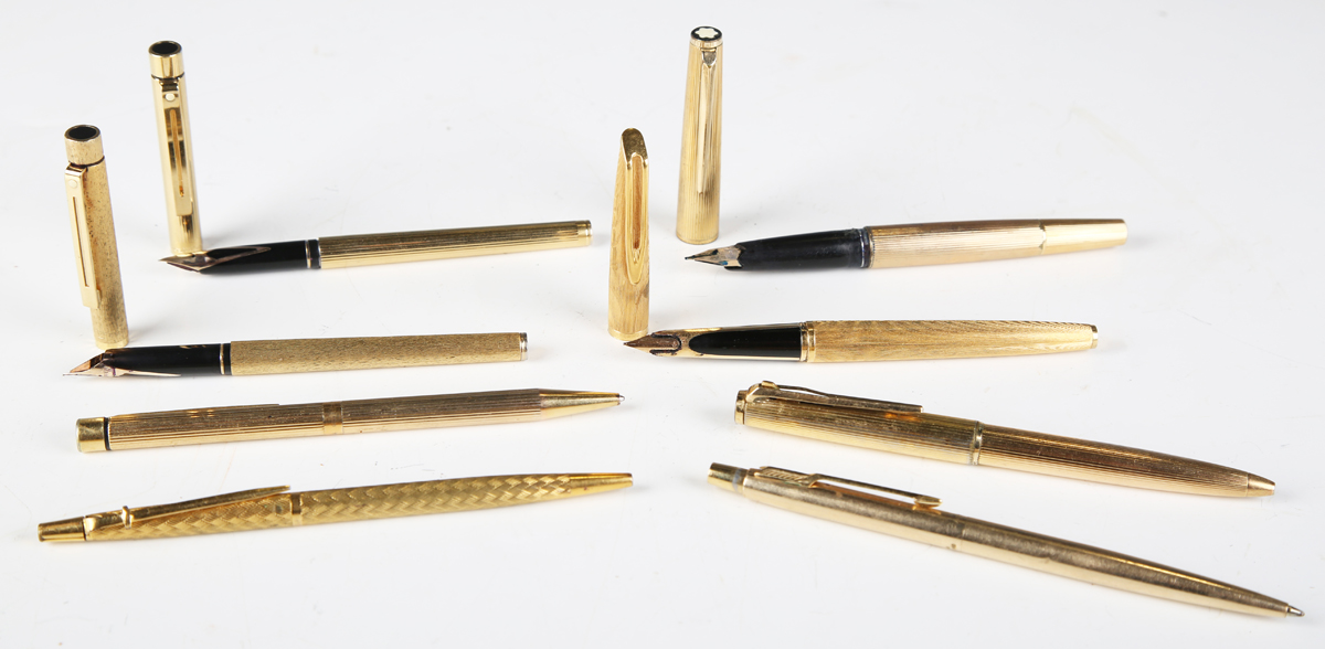 A group of eight gold plated pens, including a Montblanc fountain pen and ballpoint, a Waterman fountain pen and a Sheaffer fountain pen.
