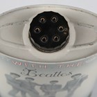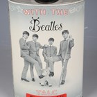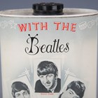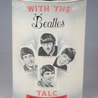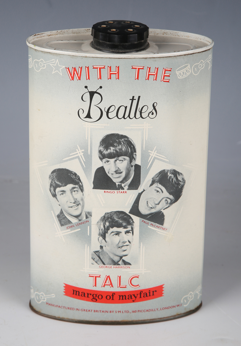 A 'With The Beatles' talc container by Margo of Mayfair, the oval section body printed with images of the Fab Four, height 18.5cm.