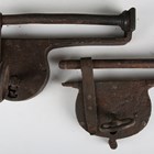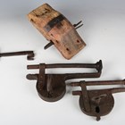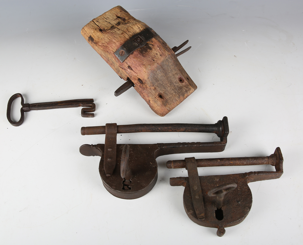 Two 17th/18th century European wrought steel bar locks with keys, lengths 28cm and 21cm, together with another 17th century wrought iron lock and key.