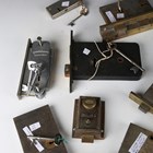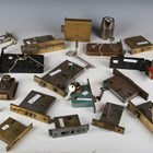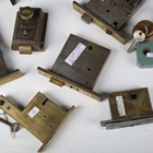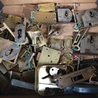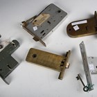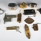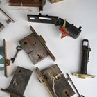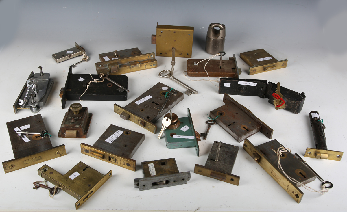 A collection of various locks, including a group of 19th century mortice locks, a 'Collins de Wagner' safe lock, two pairs of handcuffs and various cupboard and door locks.